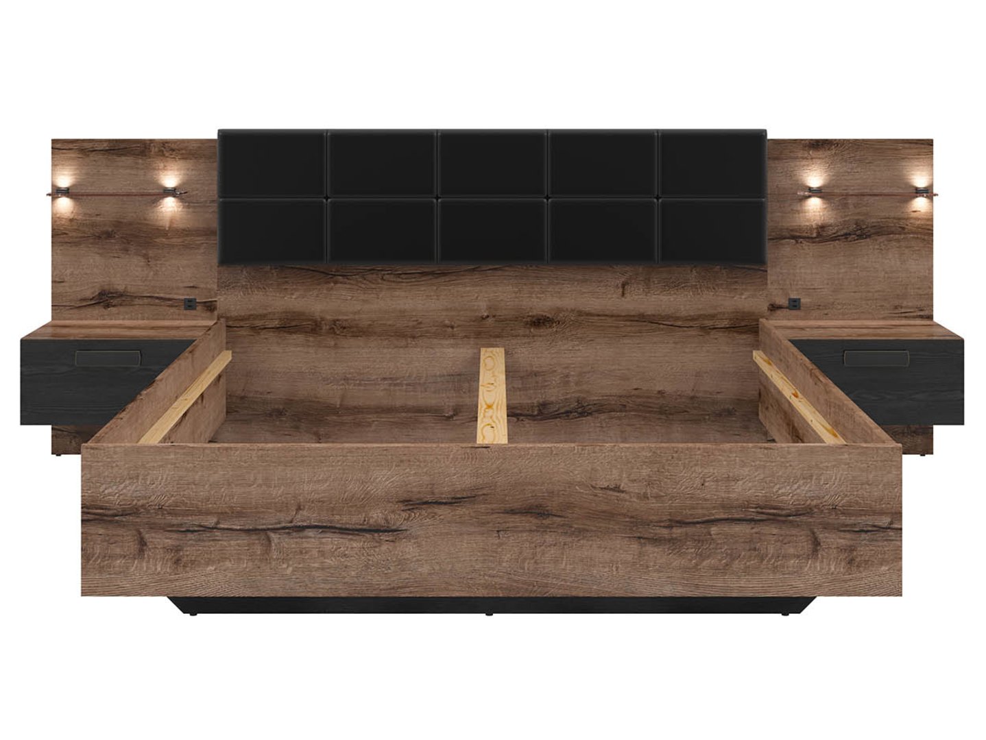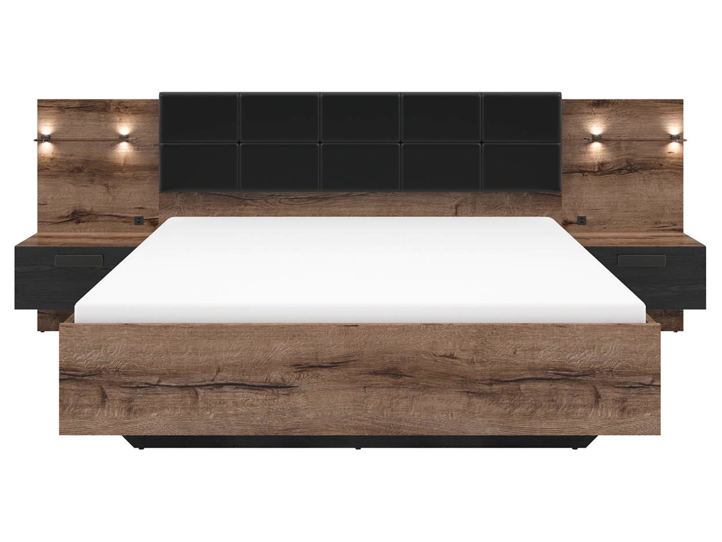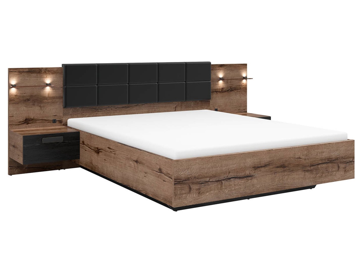 The oak-colored frame is complemented by a black upholstered headboard. Dark black oak drawer fronts add a touch of elegance.