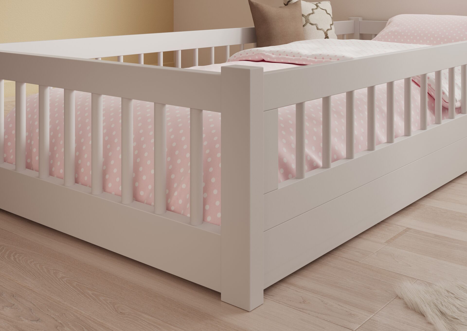 The **Dori** children’s bed is a perfect combination of functionality, aesthetics, and safety, designed with the youngest in mind. Made of solid materials and available in two classic colors: **pine** and **white**, it brings warmth and harmony to a child’s room. The **Dori** bed is a great investment in your child’s comfort and good sleep, and thanks to its timeless design and durable materials, it will serve you for many years.