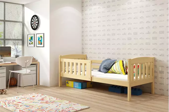 Bed frame – made of pine wood, painted with a water-based varnish. Assembly accessories – quick and easy assembly. Frame – we are the only company offering a frame made of sprung birch wood slats, mounted with a PVC bracket on a metal strip, using a click-clack system (quick assembly). Mattress – 7 cm thick, with a removable cover, air-conditioning fiber, and polyurethane foam. Cover – quilted, hypoallergenic polyester fabric, with a zipper. Load capacity – 100 kg. Curve – R2 radius. Certified bed – quality and safety in accordance with TUV standards.