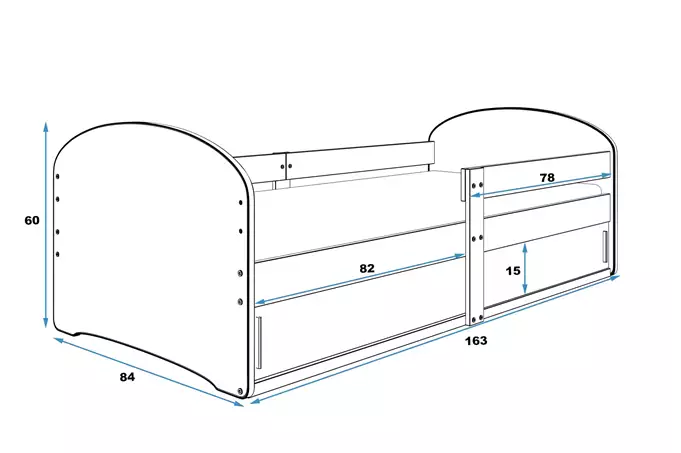 Bed frame – made of pine wood, painted with a water-based varnish. Assembly accessories – quick and easy assembly. Sticker with a Car motif. Handle for sliding fronts – made of PVC. Mattress – None. Wooden frame (pine slats). HDF board – sliding system. The bottom container does not have a board. Load capacity – 100 kg. Rounding – radius R2.