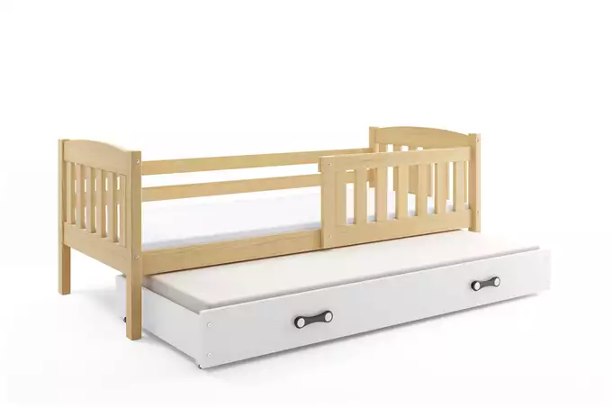Bed frame – made of pine wood, painted with a water-based varnish. Assembly accessories – quick and easy assembly. Mattresses – 7 cm thick (2 pcs.), with a removable cover, air-conditioning fiber, and polyurethane foam. Cover – quilted hypoallergenic polyester fabric, with a zipper. Frame – we are the only company offering a frame made of spring-loaded birch wood slats, mounted with a PVC handle on a metal strip, using a click-clack system (quick assembly). Drawer – made of chipboard, with an additional sleeping function. Drawer handle – made of PVC. Drawer wheels. Rounding – R2 radius. Load capacity – 100 kg per level. Certified bed – quality and safety in accordance with TUV standards.