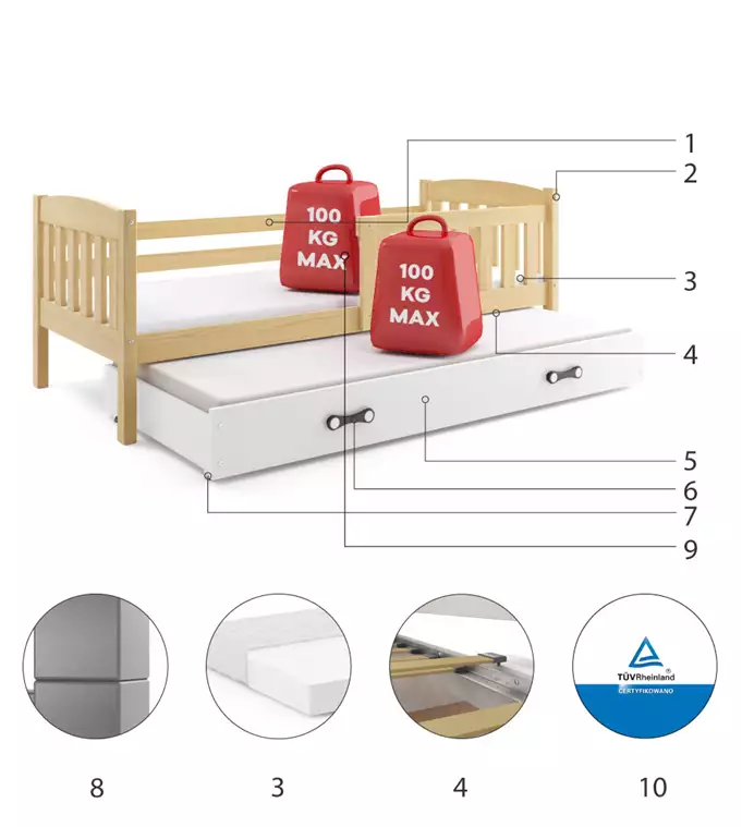 Bed frame – made of pine wood, painted with water-based varnish. Assembly accessories – quick and easy assembly. Mattress: None. Frame – we are the only company offering a frame made of spring slats, made of birch wood, mounted with a PVC handle on a metal strip, click-clack system (quick assembly). Drawer – made of chipboard, has an additional sleeping function. Drawer handle – made of PVC. Drawer wheels. Rounding – radius R2. Load capacity – 100 kg per level. Certified bed – quality and safety in accordance with TUV standards.