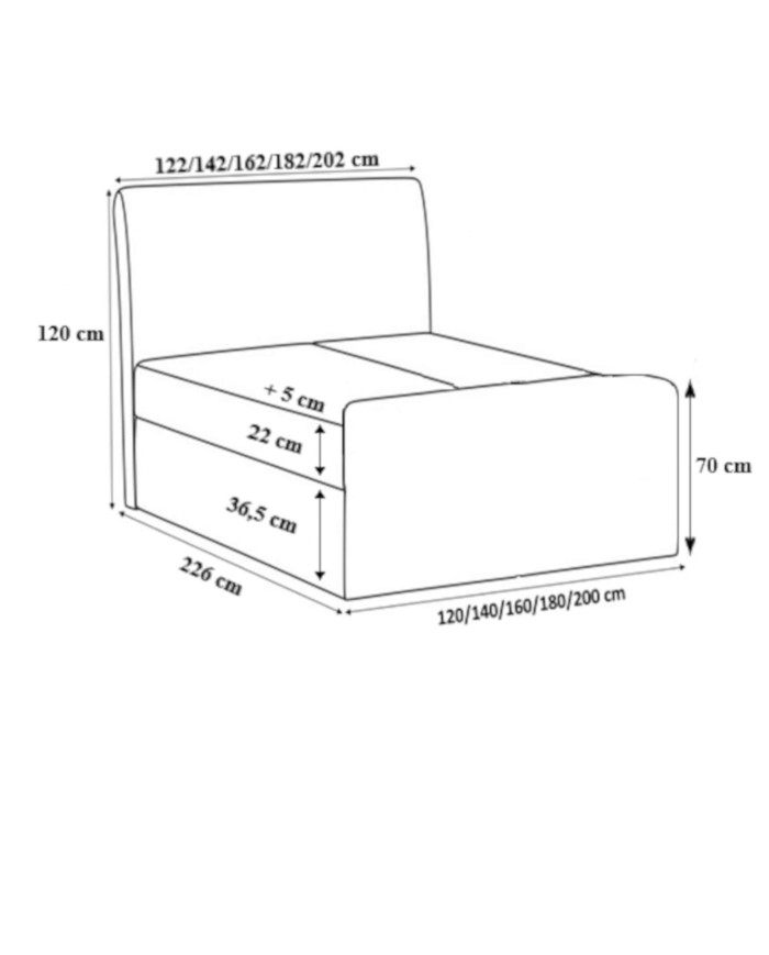 Malibu kontinentinė lova 120×200, apmušta, čiužinys, čiužinuko užtiesalas, konteineris