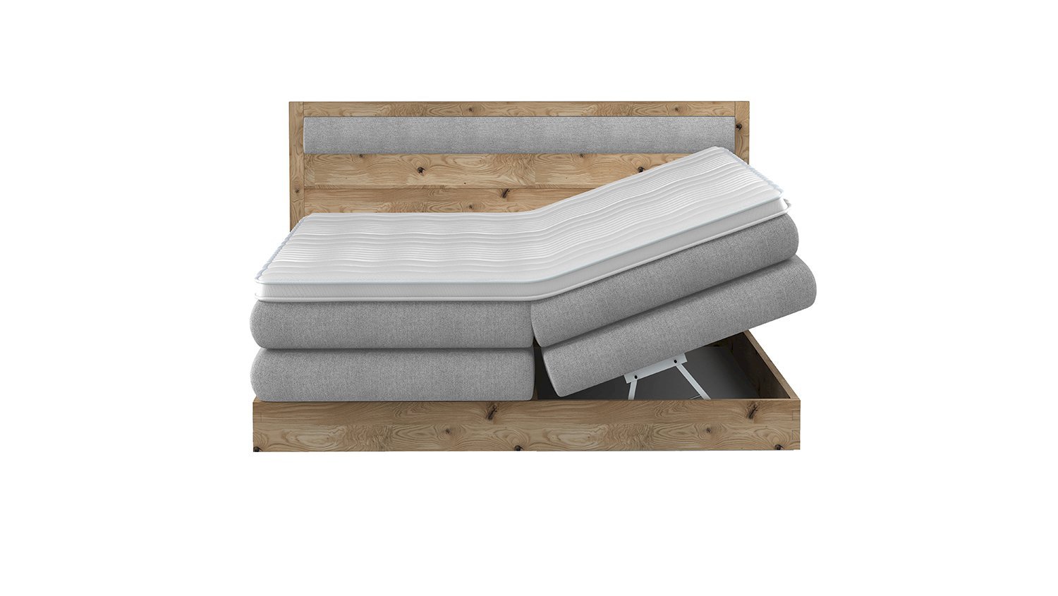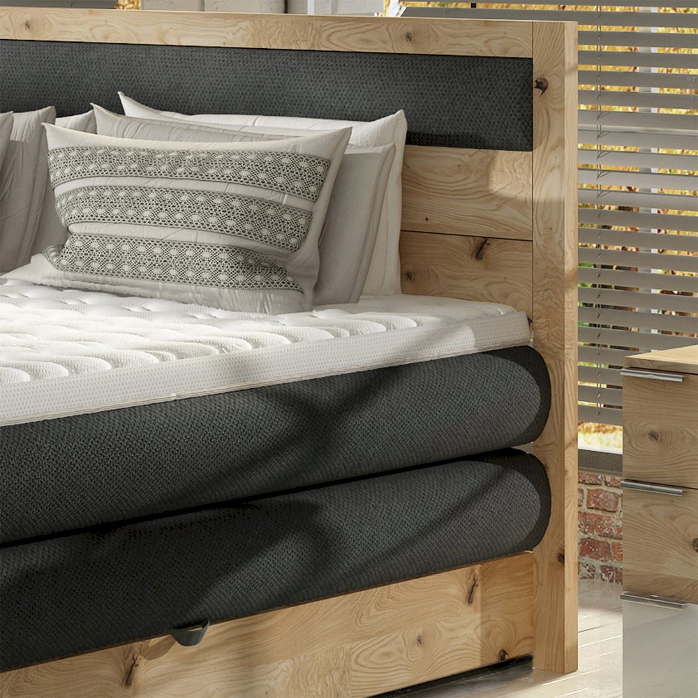 The Diori continental bed, measuring 180×200 cm, is the essence of luxury in your bedroom. The solid oak construction not only provides a durable base but also adds elegance, while the large bedding compartment makes organizing your space much easier. The double-layer mattress, consisting of a Bonnell spring mattress and an advanced 7-zone pocket spring mattress, both 18 cm thick, provides maximum comfort and support, allowing you to sink into undisturbed rest.