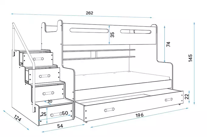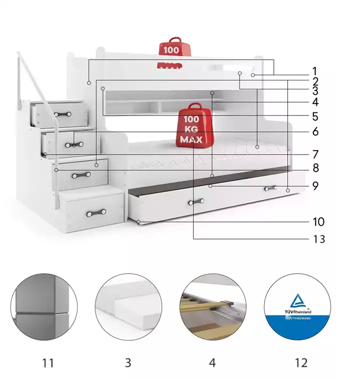 MDF board – painted with water-based varnish. Laminated chipboard. Mattresses – 200x80x9 (1 pc.), 200x120x9 (1 pc.), with removable cover, air-conditioning fiber, and polyurethane foam. Cover – quilted hypoallergenic polyester fabric, with a zipper. Frame – we are the only company offering a frame made of spring slats, made of birch wood, mounted with a PVC handle on a metal strip, click-clack system (quick assembly). Assembly accessories – quick and easy assembly. Drawer handle – made of PVC. Runners. Barrier. HDF board. Drawer wheels. Rounding – R2 radius. Certified bed – quality and safety in accordance with TUV standards. Load capacity – 100 kg per level.