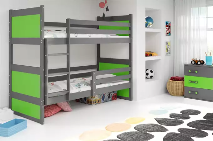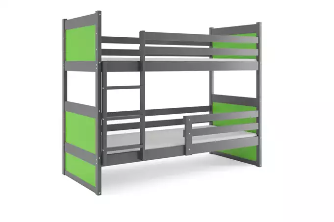 Bed frame – made of pine wood, painted with a water-based varnish. Assembly accessories – quick and easy assembly. Frame – we are the only company offering a frame made of sprung birch wood slats, mounted with a PVC bracket on a metal strip, using a click-clack system (quick assembly). MDF board – painted with a water-based varnish. Mattresses – 7 cm thick (2 pcs.), with a removable cover, air-conditioning fiber, and polyurethane foam. Cover – quilted hypoallergenic polyester fabric, with a zipper. Load capacity – 100 kg per level. Curve – R2 radius. Certified bed – quality and safety in accordance with TUV standards.