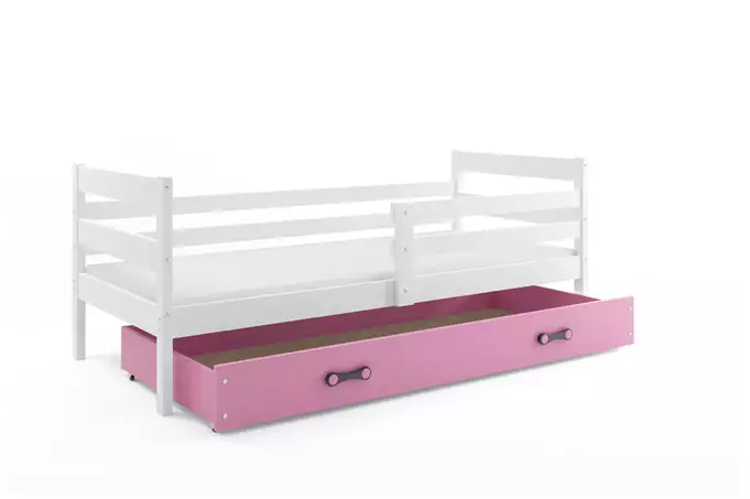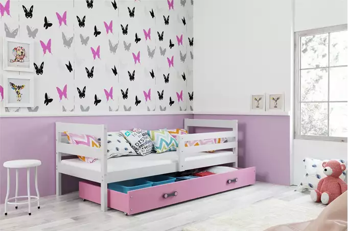 ERYK viengulė jaunimo lova 90×200 su čiužiniu ir stalčiumi, balta/rožinė