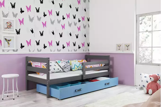 ERYK 90X200 viengulė jaunimo lova su čiužiniu ir stalčiumi, grafito/mėlyna