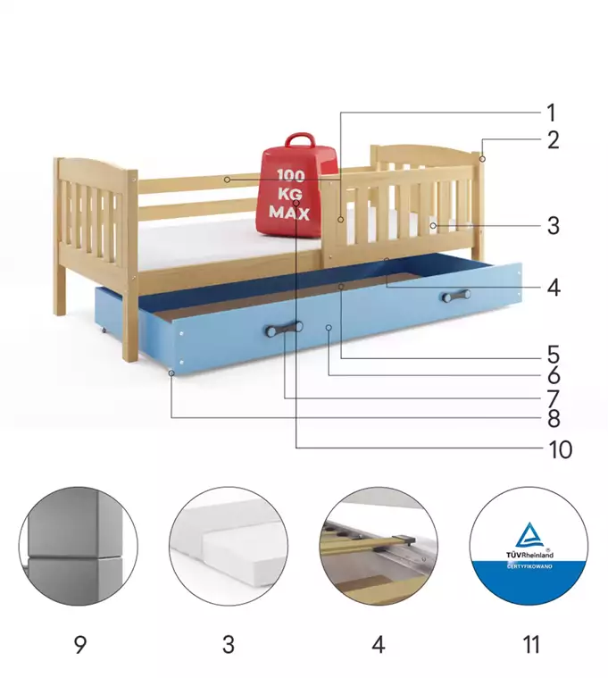Bed frame – made of pine wood, painted with a water-based varnish. Assembly accessories – quick and easy assembly.