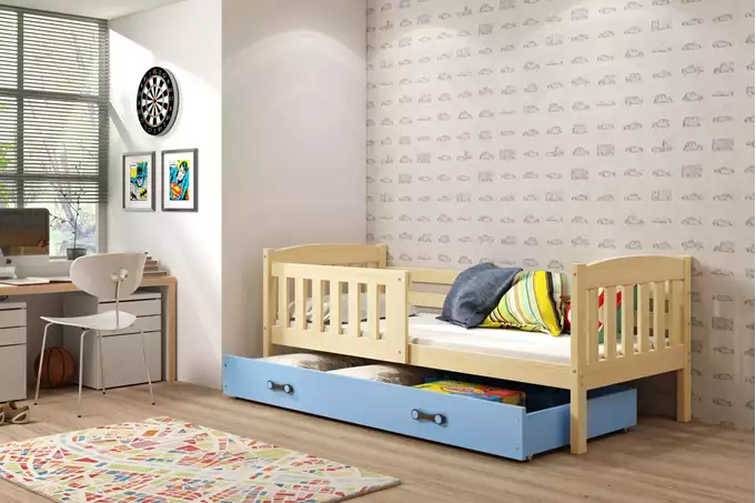 KUBUŚ viengulė jaunimo lova 80×190 su stalčiumi, pušis/mėlyna