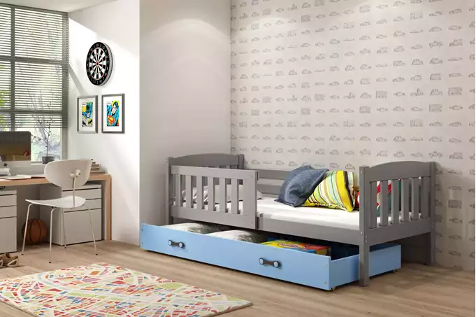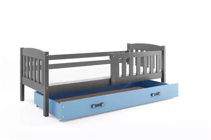Bed frame – made of pine wood, painted with a water-based varnish. Assembly accessories – quick and easy assembly. Mattress – 7 cm thick, with a removable cover, air-conditioning fiber, and polyurethane foam. Cover – quilted hypoallergenic polyester fabric, with a zipper. Frame – we are the only company offering a frame made of spring slats, made of birch wood, mounted with a PVC handle on a metal strip, using a click-clack system (quick assembly). HDF board. Drawer – made of chipboard. Drawer handle – made of PVC. Drawer casters. Rounding – R2 radius. Load capacity – 100 kg. Certified bed – quality and safety in accordance with TUV standards.