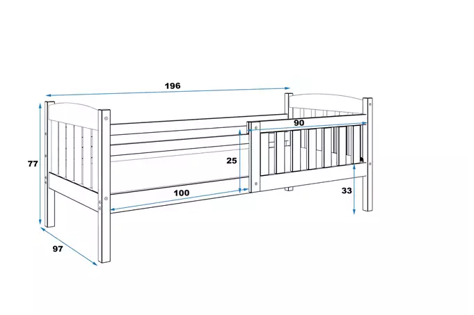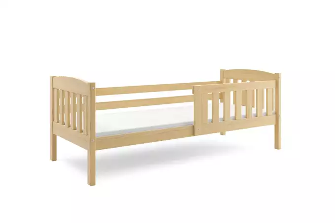 Bed frame – made of pine wood, painted with a water-based varnish. Assembly accessories – quick and easy assembly. Frame – we are the only company offering a frame made of sprung birch wood slats, mounted with a PVC bracket on a metal strip, using a click-clack system (quick assembly). Mattress – 7 cm thick, with a removable cover, air-conditioning fiber, and polyurethane foam. Cover – quilted, hypoallergenic polyester fabric, with a zipper. Load capacity – 100 kg. Curve – R2 radius. Certified bed – quality and safety in accordance with TUV standards.