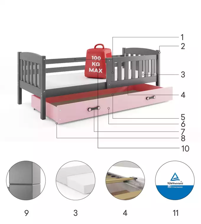 Be the first to review “KUBUŚ viengulė jaunimo lova 90×190 su stalčiumi, grafito/rožinė”