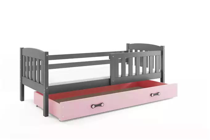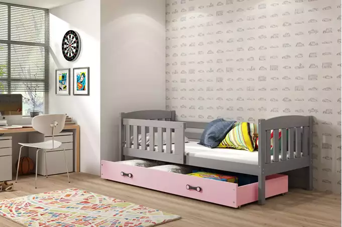 KUBUŚ viengulė jaunimo lova 90×190 su stalčiumi, grafito/rožinė