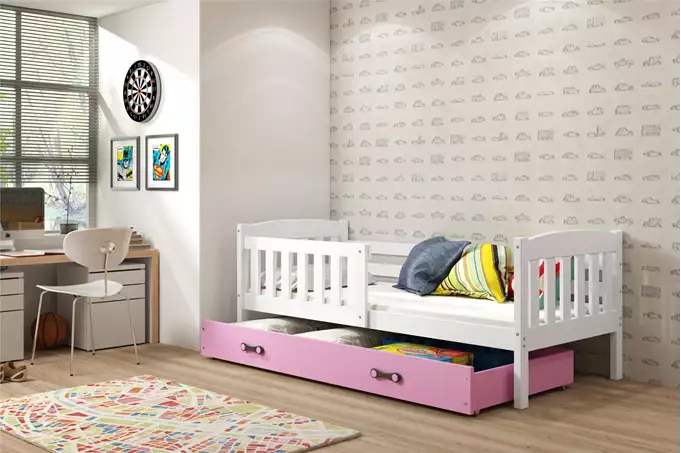 KUBUŚ jaunimo viengulė lova 90×200 su čiužiniu ir stalčiumi, balta/rožinė