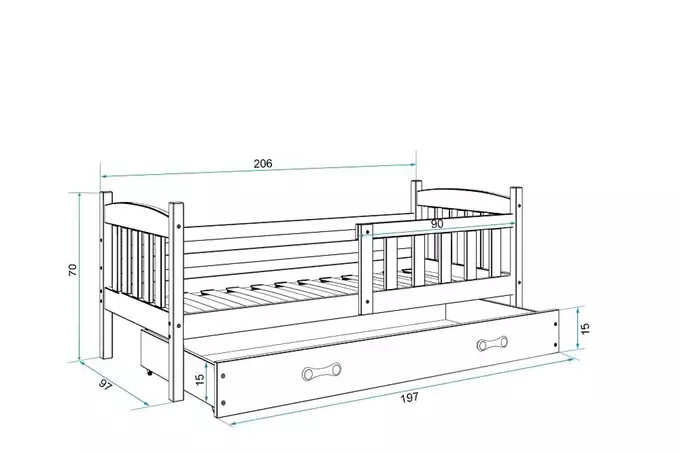Bed frame – made of pine wood, painted with a water-based varnish. Assembly accessories – quick and easy assembly. Mattress – 7 cm thick, with a removable cover, air-conditioning fiber, and polyurethane foam. Cover – quilted hypoallergenic polyester fabric, with a zipper. Frame – we are the only company offering a frame made of spring slats, made of birch wood, mounted with a PVC handle on a metal strip, using a click-clack system (quick assembly). HDF board. Drawer – made of chipboard. Drawer handle – made of PVC. Drawer casters. Rounding – R2 radius. Load capacity – 100 kg. Certified bed – quality and safety in accordance with TUV standards.