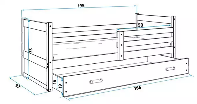 RICO viengulė jaunimo lova 90×190 su stalčiumi, balta/grafito spalvos