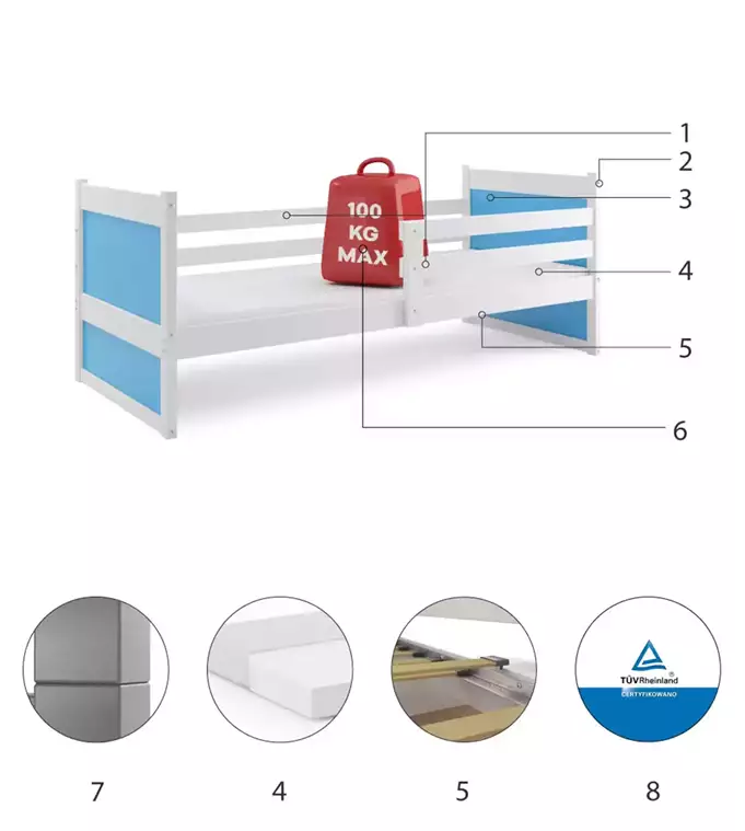 Bed frame – made of pine wood, painted with a water-based varnish. Assembly accessories – quick and easy assembly. MDF board – painted with a water-based varnish. Mattress: None. Frame – we are the only company offering a frame made of spring slats, made of birch wood, mounted with a PVC bracket on a metal strip, with a click-clack system (quick assembly). Load capacity – 100 kg. Rounding – radius R2. Certified bed – quality and safety in accordance with TUV standards.