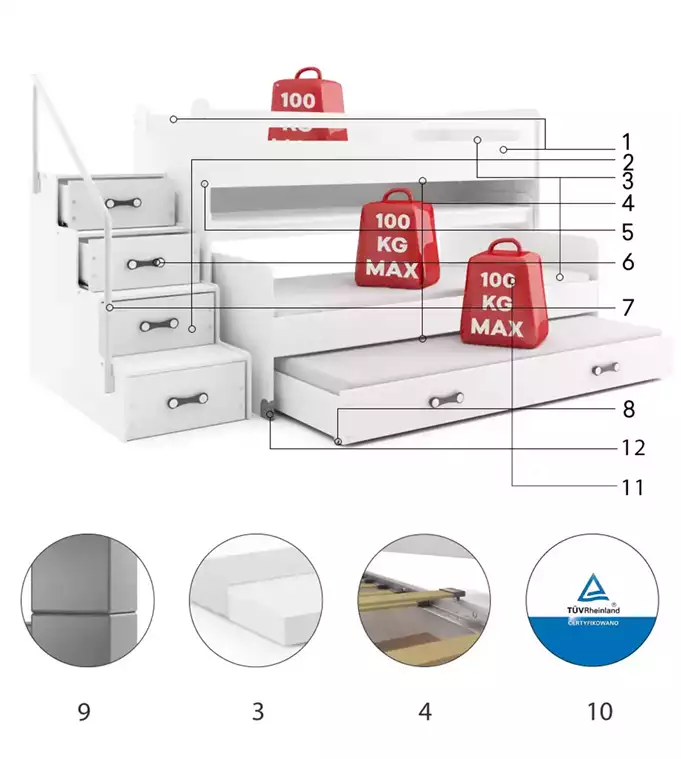 MDF board – painted with water-based varnish. Laminated chipboard. Mattresses – 200x80x9 (1 pc.), 190x80x9 (1 pc.), 180x80x7 (1 pc.), with removable cover, air-conditioning fiber, and polyurethane foam. Cover – quilted hypoallergenic polyester fabric, with a zipper. Frame – we are the only company offering a frame made of spring slats, made of birch wood, mounted with a PVC handle on a metal strip, click-clack system (quick assembly). Assembly accessories – quick and easy assembly. Drawer handle – made of PVC. Rail. Drawer casters. Rounding – R2 radius. Certified bed – quality and safety in accordance with TUV standards. Load capacity – 100 kg per level.