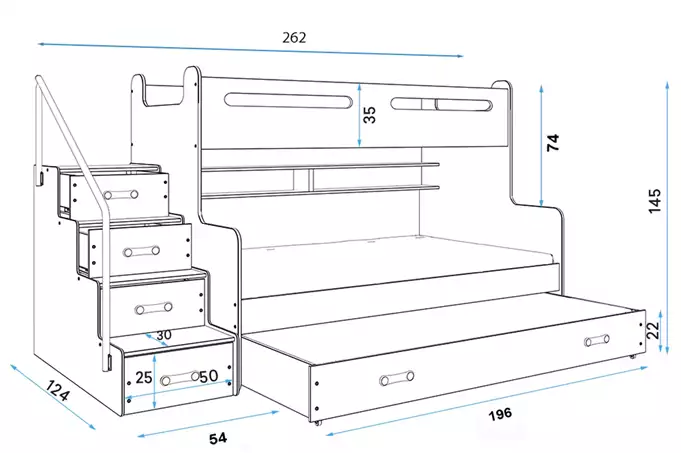 MDF board – painted with water-based varnish. Chipboard, laminated. Mattresses – 200x80x9 (1 pc.), 200x120x9 (1 pc.), 190x80x7 (1 pc.), with a removable cover, air-conditioning fiber and polyurethane foam. Cover – quilted hypoallergenic fabric, made of polyester, with a zipper. Frame – we are the only company offering a frame made of spring slats, made of birch wood, mounted with a PVC handle on a metal strip, using a click-clack system (quick assembly). Assembly accessories – quick and easy assembly. Drawer handle – made of PVC. Runners. Barrier. HDF board. Drawer wheels. Rounding – radius R2. Certified bed – quality and safety in accordance with TUV standards. Load capacity – 100 kg per level.