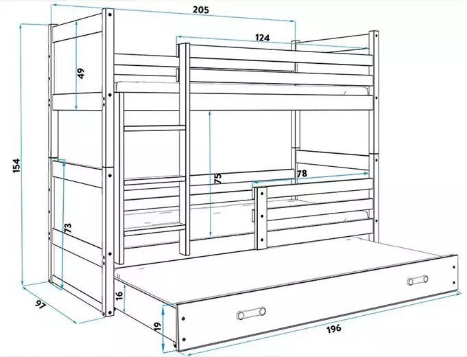 Bed frame – made of pine wood, unvarnished. Assembly accessories – quick and easy assembly. Frame – we are the only company offering a frame made of spring slats, made of birch wood, mounted with a PVC handle on a metal strip, click-clack system (quick assembly). MDF board – painted with water-based varnish. Mattress: None. Drawer – made of chipboard, has an additional sleeping function. Drawer handle – made of PVC. Drawer wheels. Rounding – radius R2. Load capacity – 100 kg per level. Certified bed – quality and safety in accordance with TUV standards.