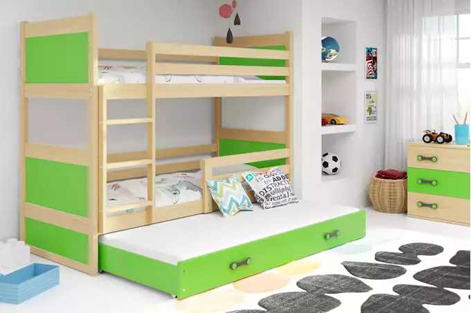 RICO 90X200 trijų asmenų jaunimo lova su stalčiumi, pušis/žalia