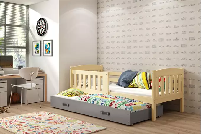 Bed frame – made of pine wood, painted with a water-based varnish. Assembly accessories – quick and easy assembly. Mattresses – 200×90 (1 pc.), 190×80 (1 pc.), with a removable cover, air-conditioning fiber, and polyurethane foam. Cover – quilted hypoallergenic polyester fabric, with a zipper. Frame – we are the only company offering a frame made of spring slats, made of birch wood, mounted with a PVC handle on a metal strip, with a click-clack system (quick assembly). Drawer – made of chipboard, has an additional sleeping function. Drawer handle – made of PVC. Drawer wheels. Rounding – radius R2. Load capacity – 100 kg per level. Certified bed – quality and safety in accordance with TUV standards.