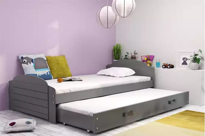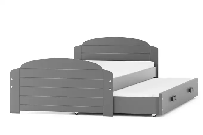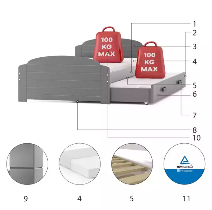 Bed frame – made of pine wood, painted with water-based varnish. Assembly accessories – quick and easy assembly. MDF board – painted with water-based varnish. Mattresses – 200×90 (1 pc.), 190×80 (1 pc.), with removable cover, air-conditioning fiber and polyurethane foam. Cover – quilted, hypoallergenic fabric, made of polyester, with a zipper. Frame – we are the only company to offer a frame made of spring slats, made of birch wood, mounted with a PVC handle on a metal strip, using a click-clack system (quick assembly). Drawer – made of chipboard, has an additional sleeping function. Drawer handle – made of PVC. Drawer wheels. Rounding – radius R2. Load capacity – 100 kg per level. Certified bed – quality and safety in accordance with TUV standards.