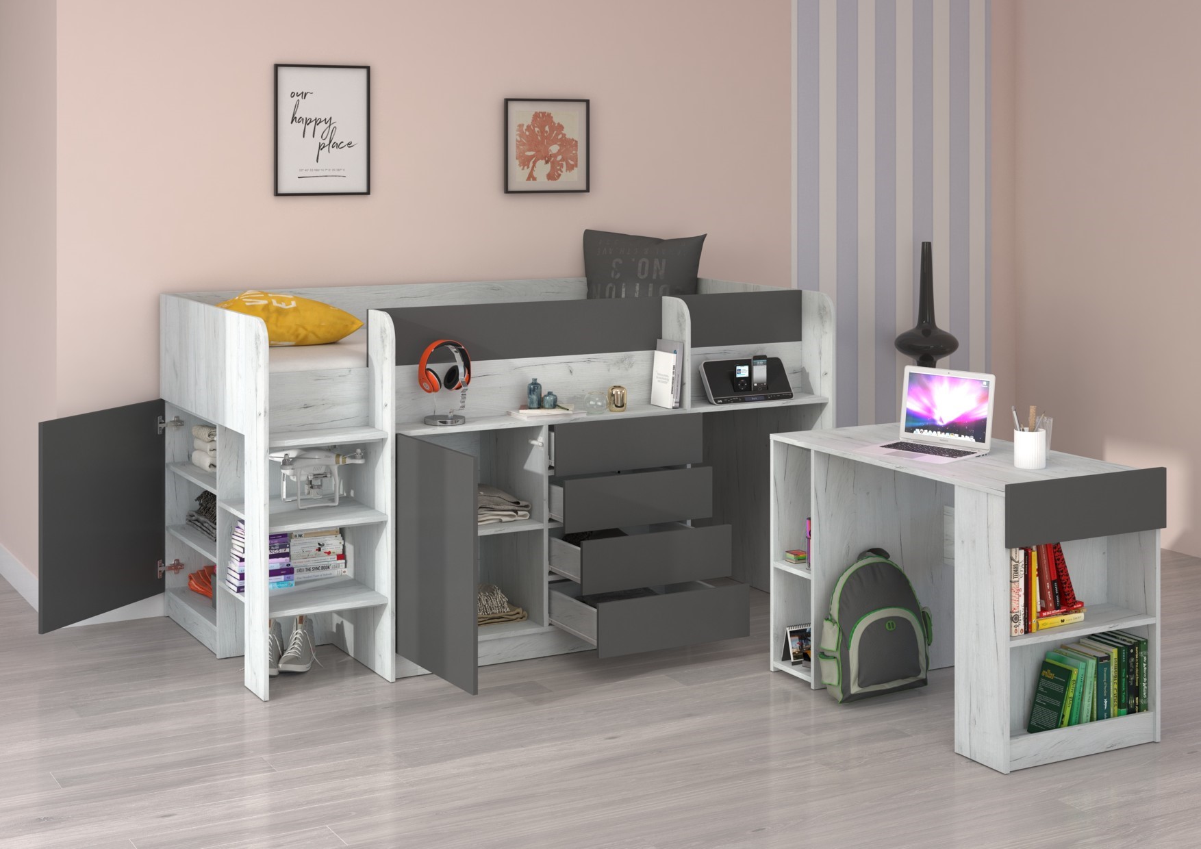 Dviaukštė lova, rašomasis stalas, komoda, antresolė, EMI L craft, baltas grafitas