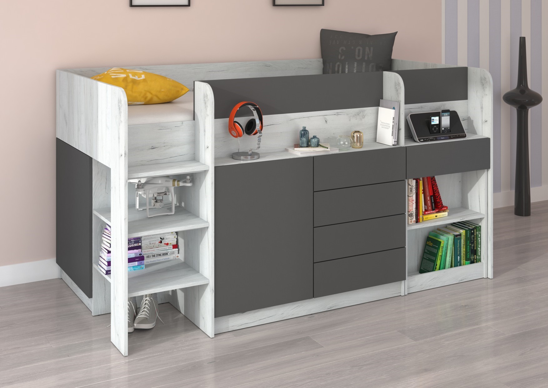 EMI L mezzanine without mattress 90×200, 16 mm board, ABS edge, PUSH TO OPEN opening, max mattress height 12 cm, Color: white craft oak / graphite