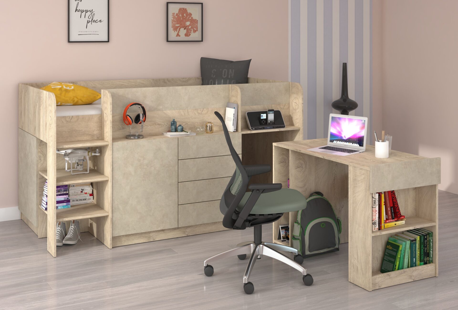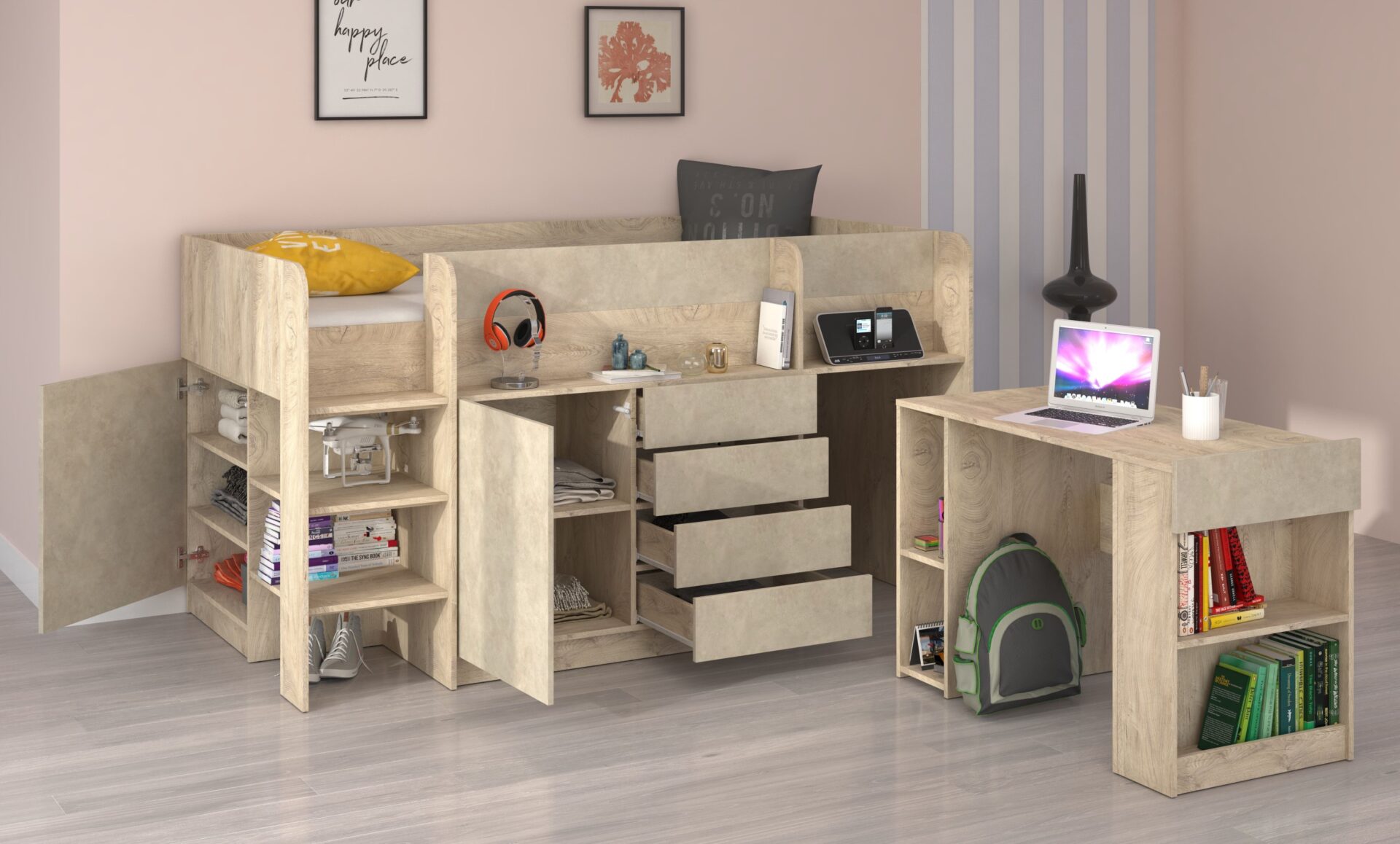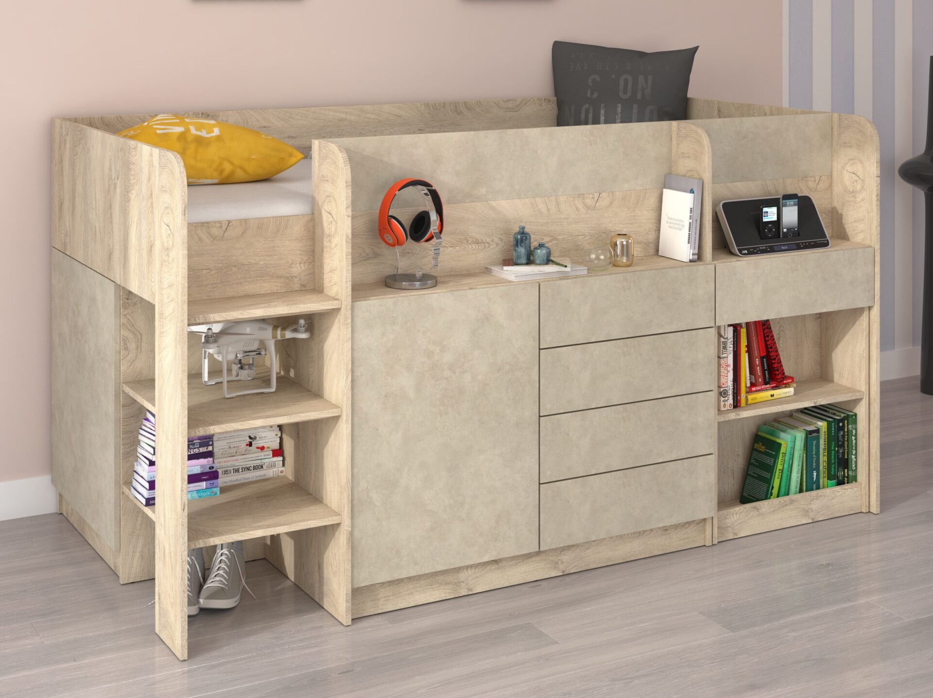 EMI L mezzanine without mattress 90×200, 16 mm board, ABS edge, PUSH TO OPEN opening, max mattress height 12 cm, Color: endgrain oak / granada almond