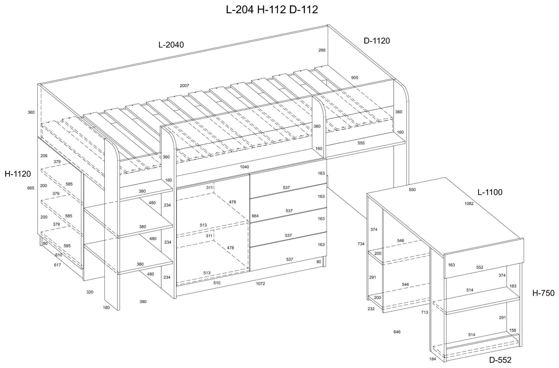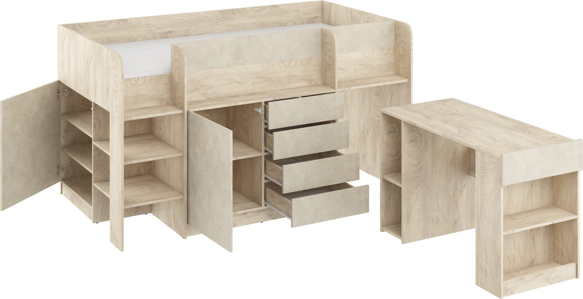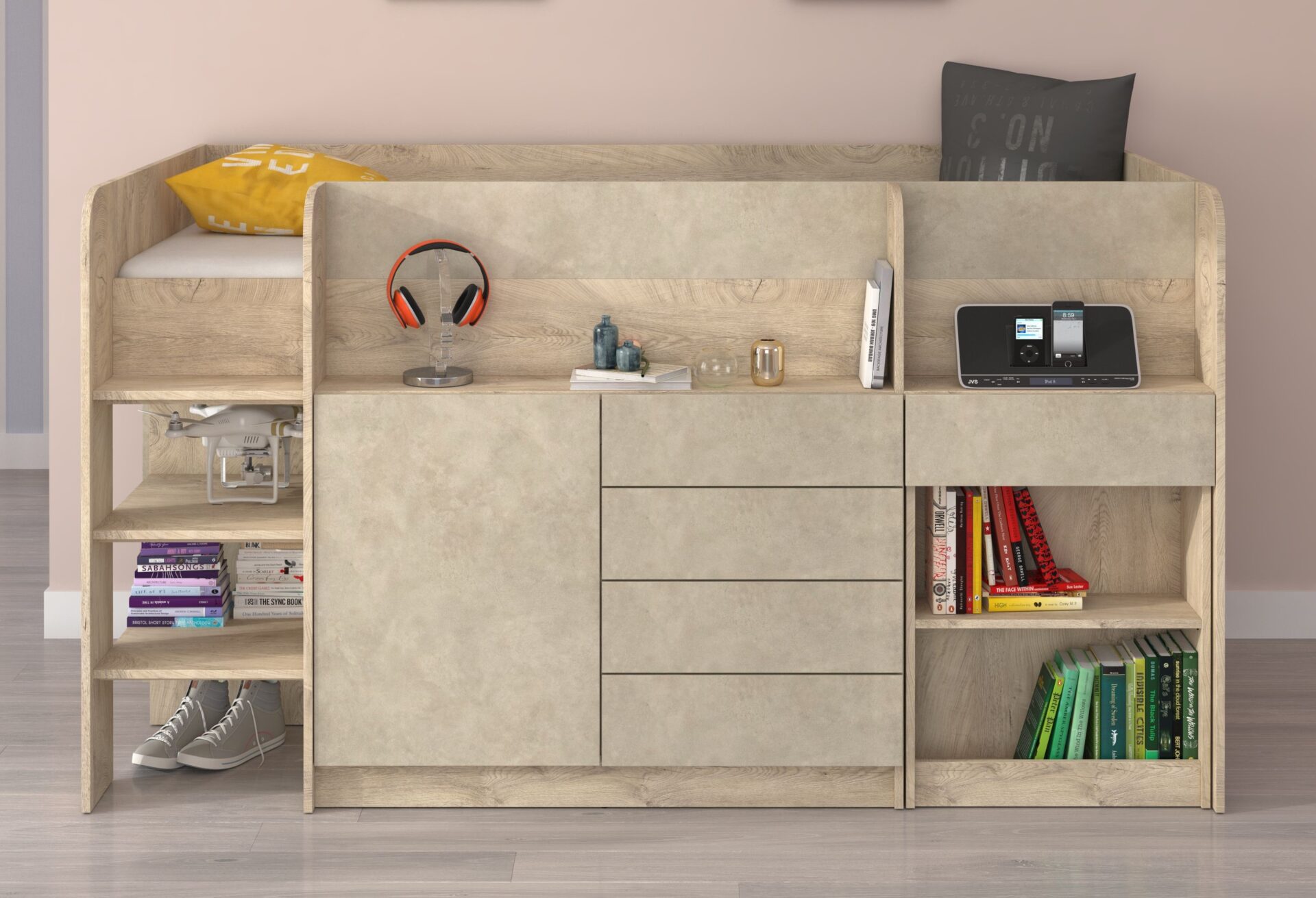 EMI L mezzanine without mattress 90×200, 16 mm board, ABS edge, PUSH TO OPEN opening, max mattress height 12 cm, Color: endgrain oak / granada almond
