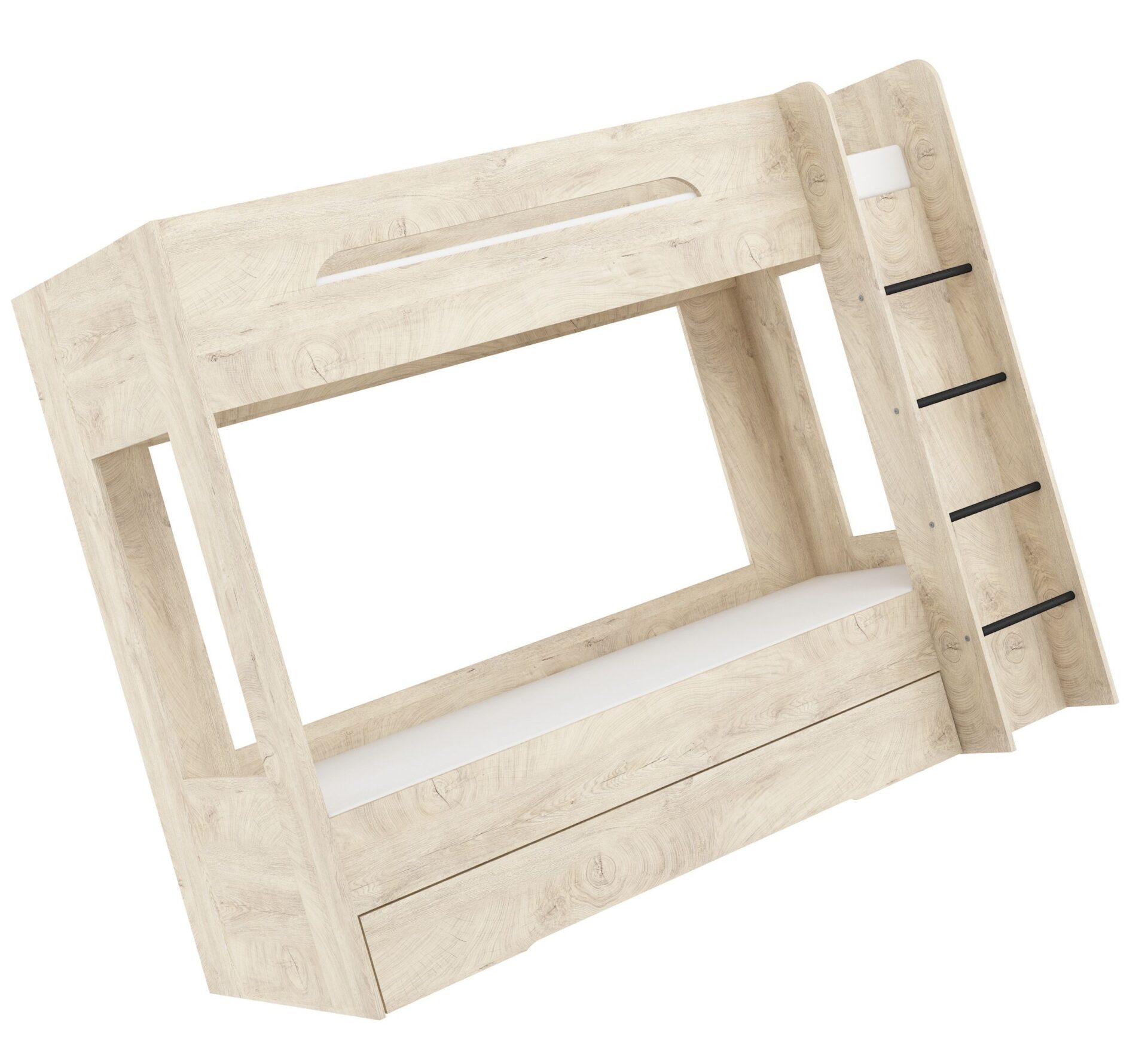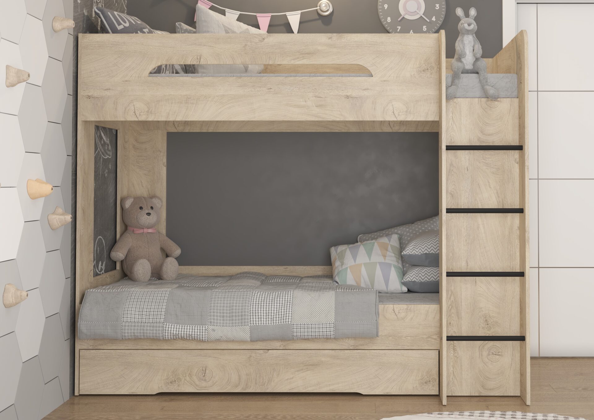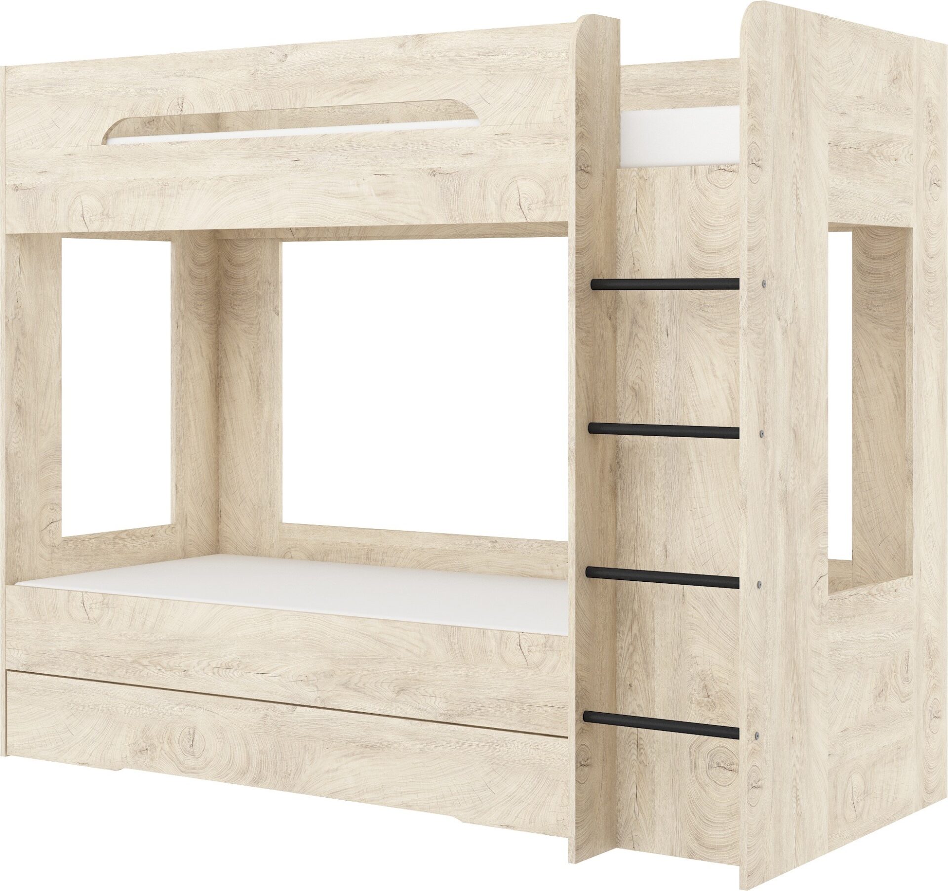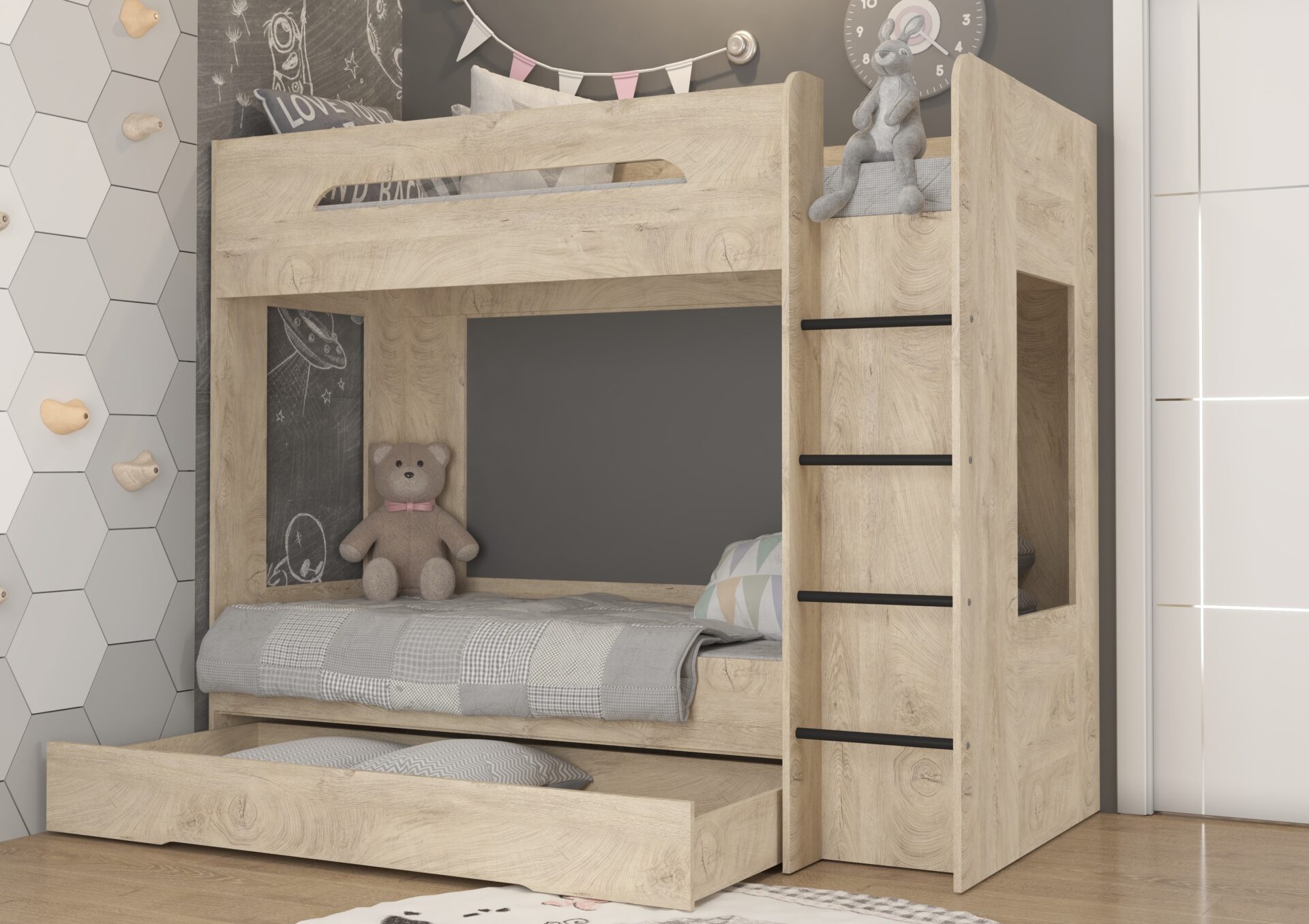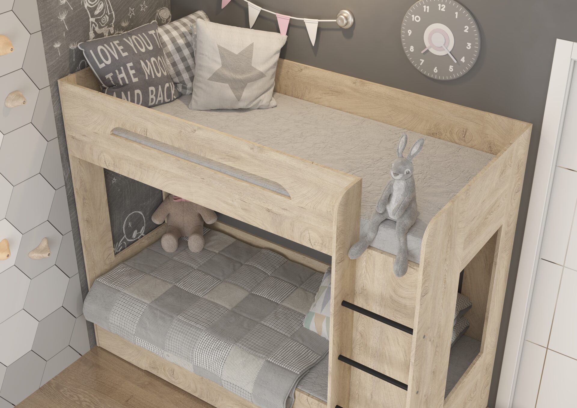 BLIN bunk bed without mattresses 80×200. 16 mm board, ABS edge, max mattress height 12 cm. Color: endgrain oak.