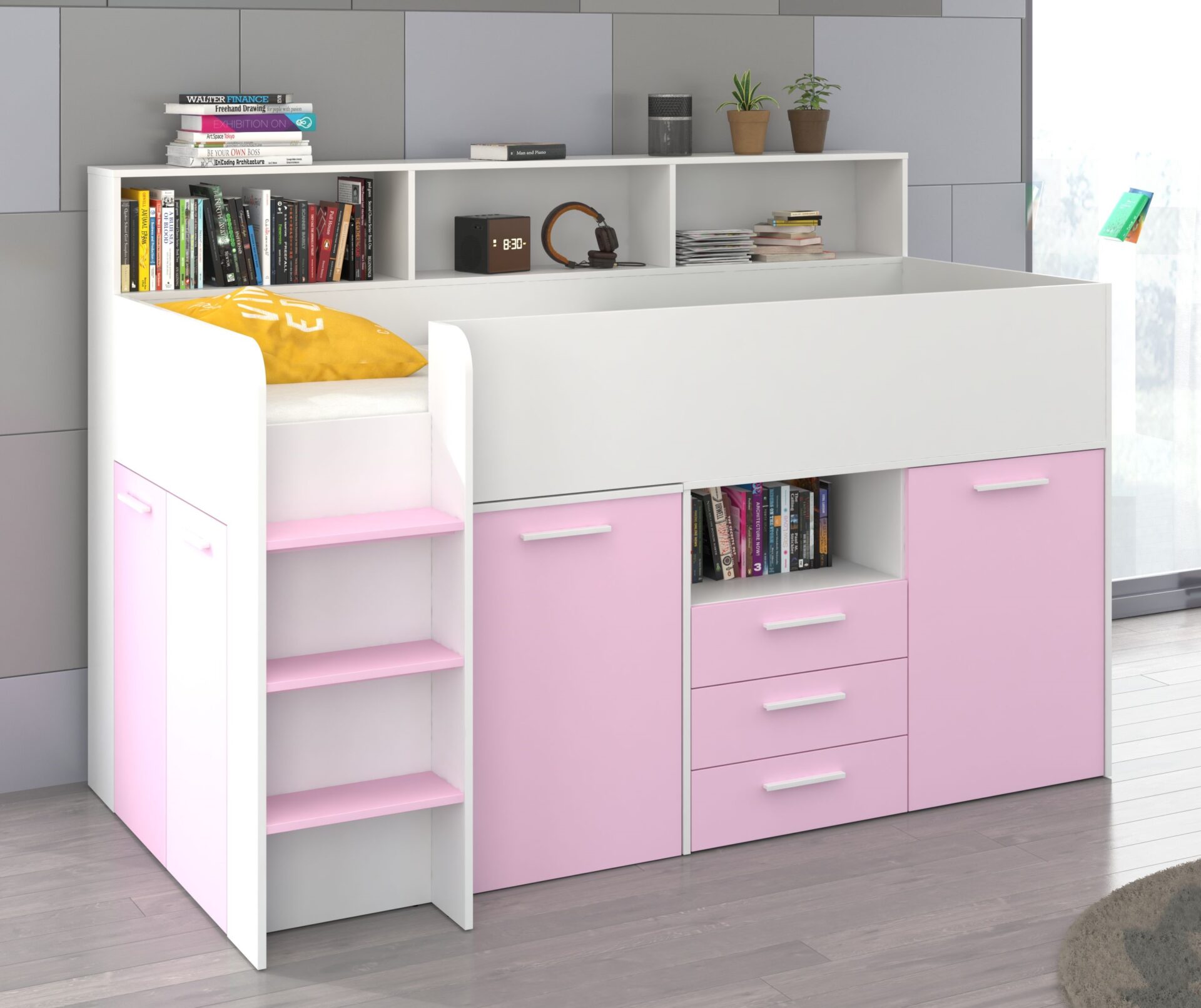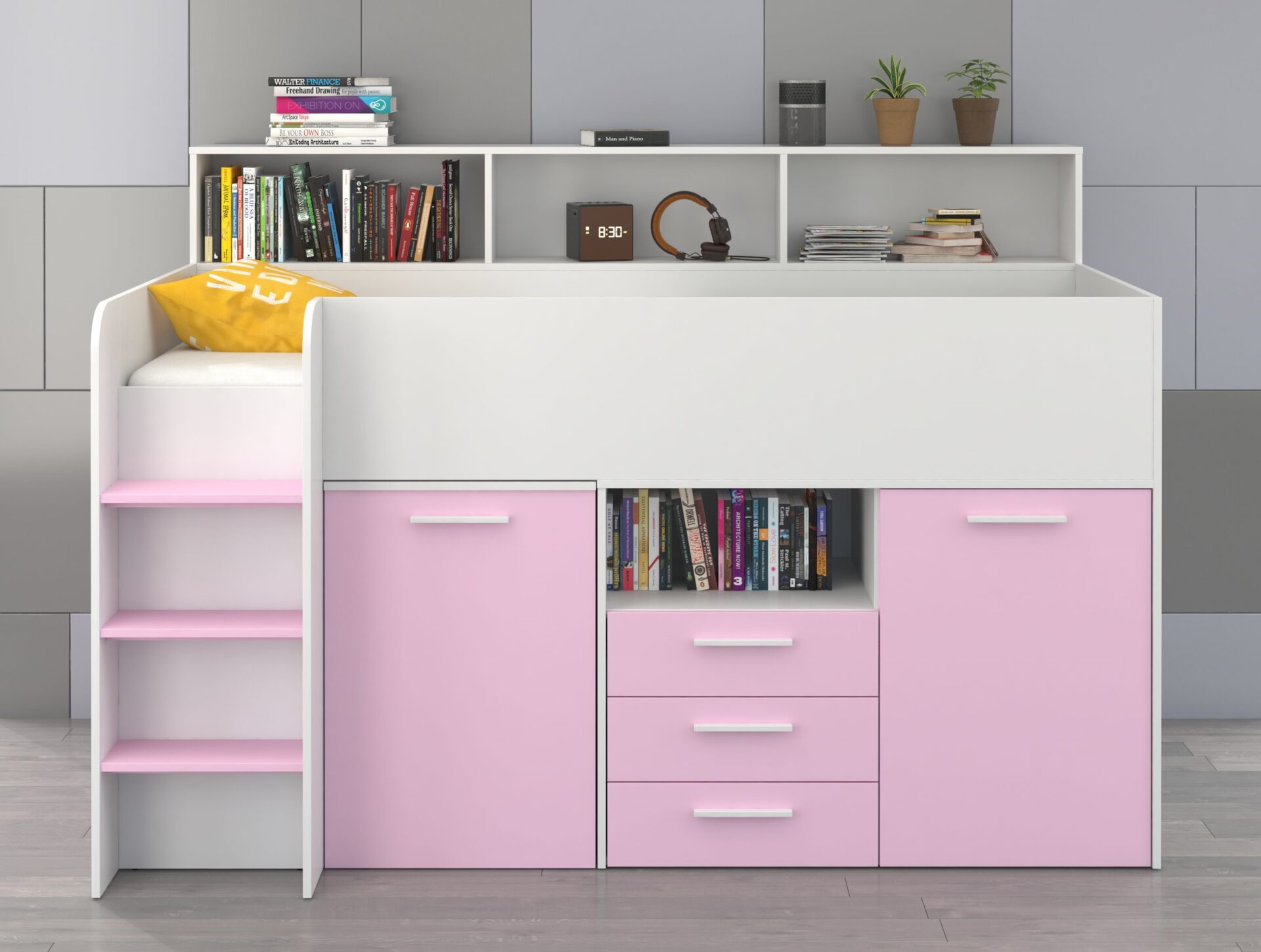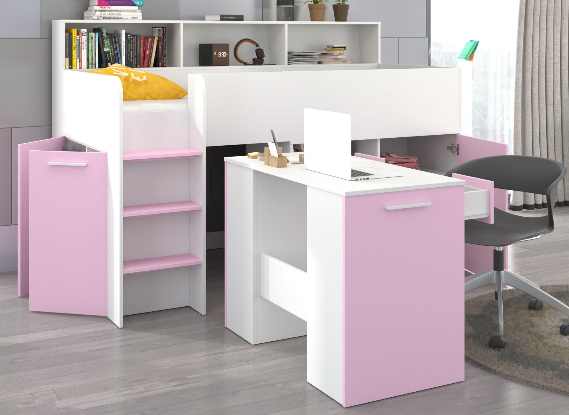 ENO L mezzanine without mattress 80×200. 16 mm board, ABS edge, soft-close in drawers and cabinets. Max mattress height 12 cm. Color: white/lavender.