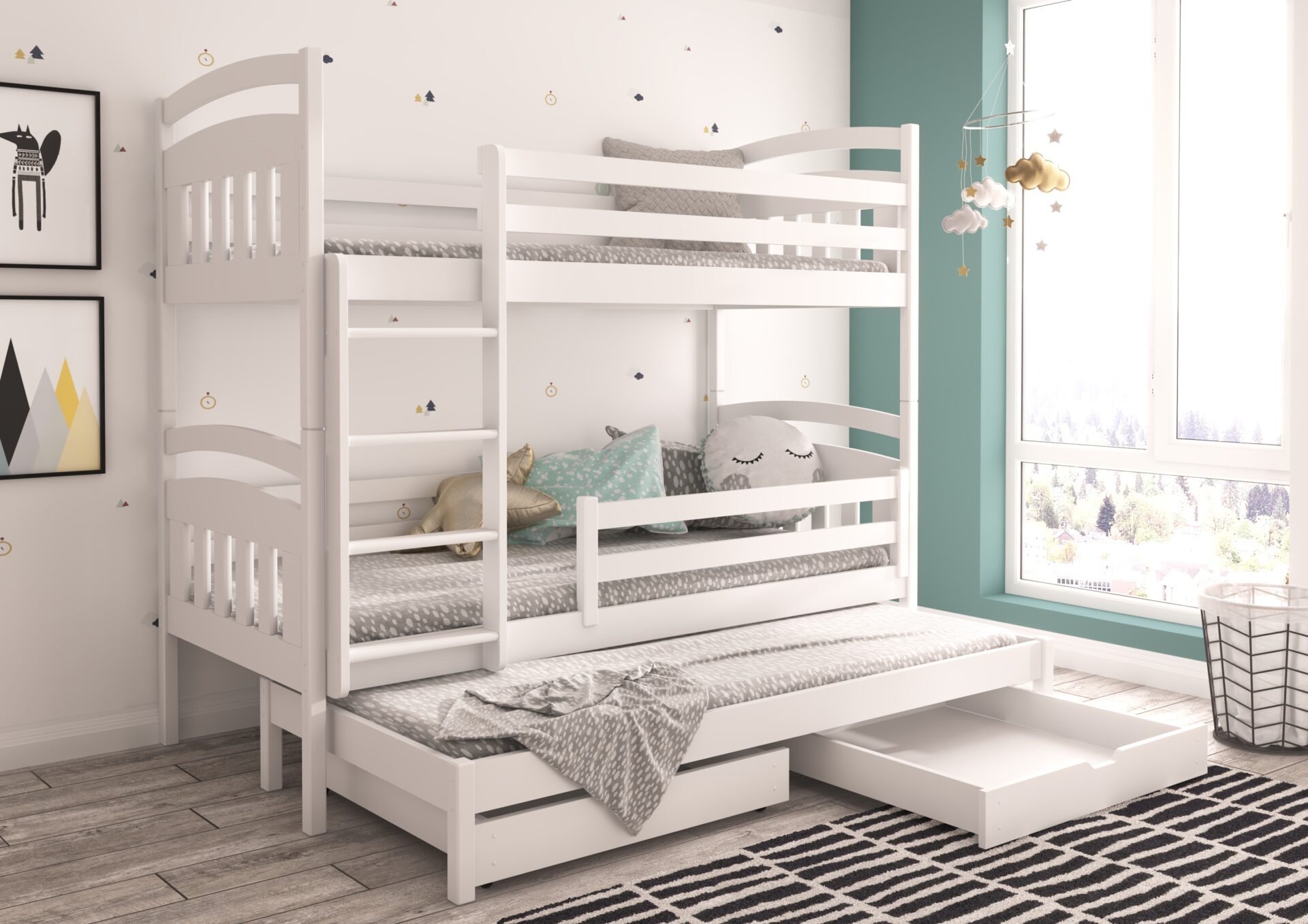 The ALDO 3-person bunk bed is a great way to save space in a small children’s room. It features a stable ladder and safety rails on almost every side of the frame, ensuring your child is completely safe while sleeping. Furthermore, the bed features two spacious and functional drawers for bedding. The bed comes with a set of three 8 cm thick foam mattresses.