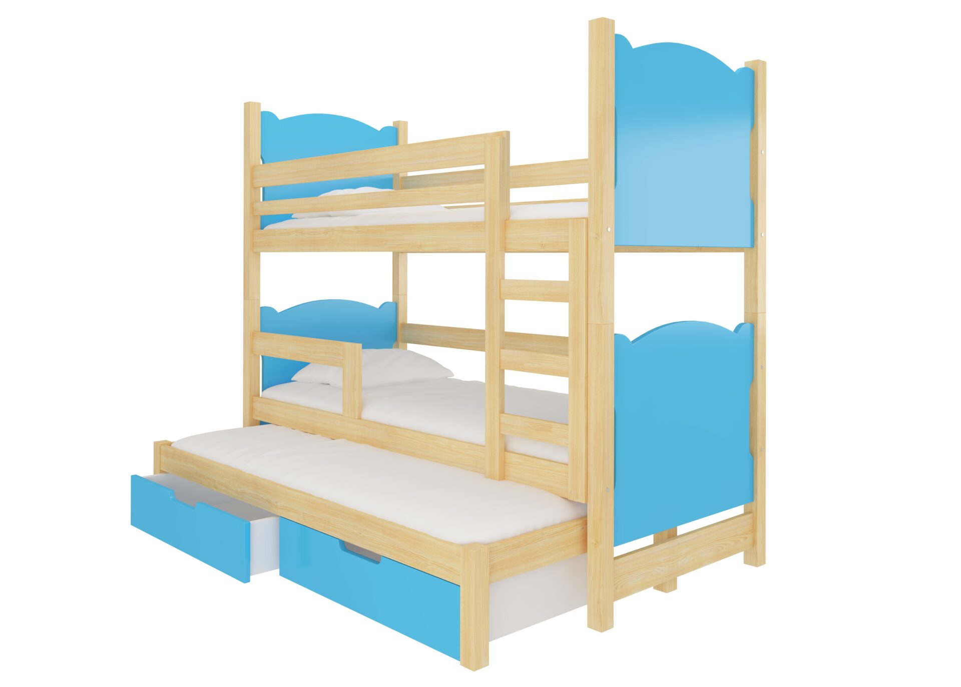 Trivietė dviaukštė lova su LETICIA čiužiniais, pušis/mėlyna, ADRK