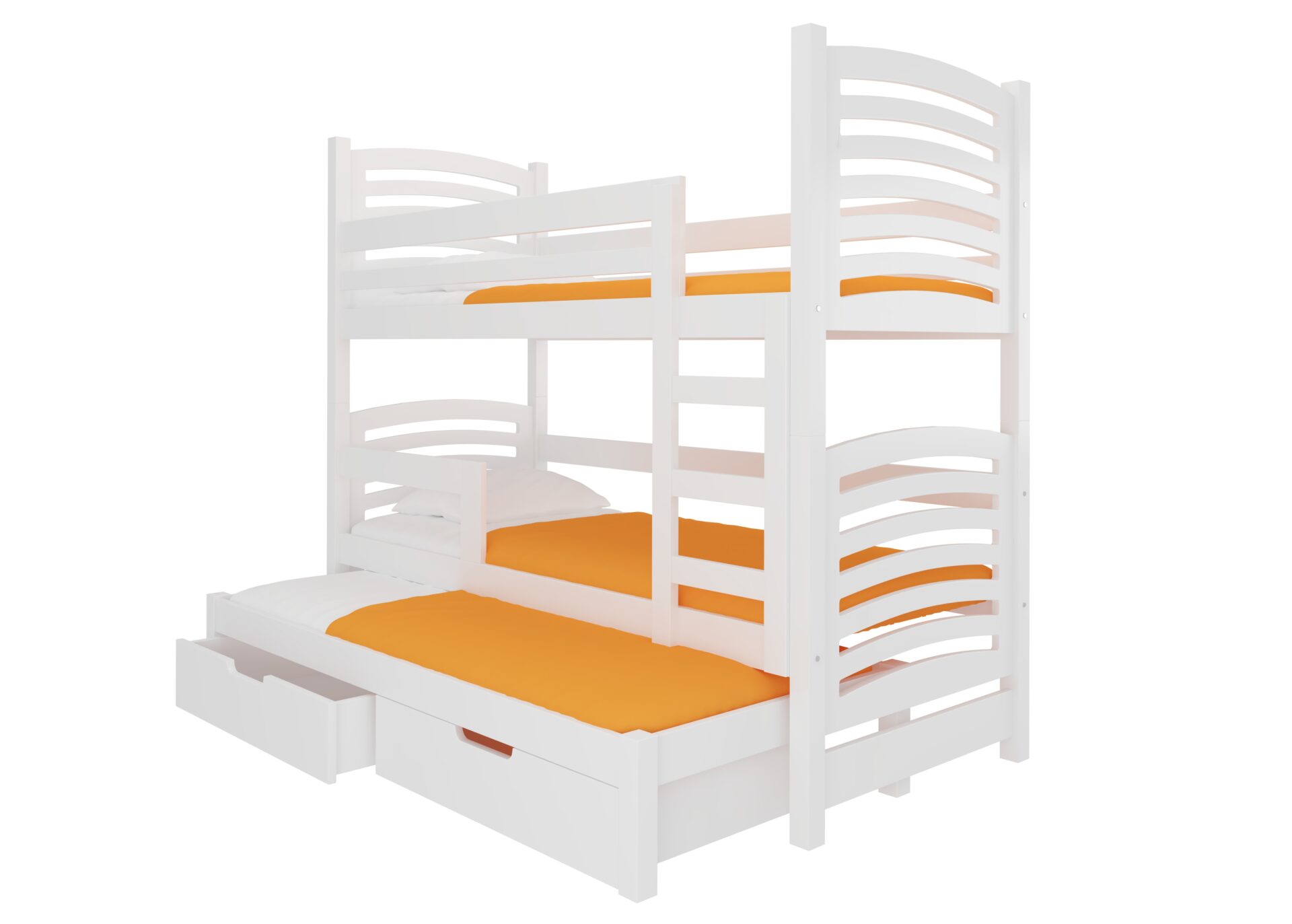 The SORIA three-person bunk bed is a great way to save space in a small children’s room. It features a stable ladder and safety rails on almost every side of the bed, ensuring your child is completely safe while sleeping. Furthermore, there are two spacious and functional drawers for bedding at the bottom. The bed comes with a set of three foam mattresses with zippered cotton covers.
