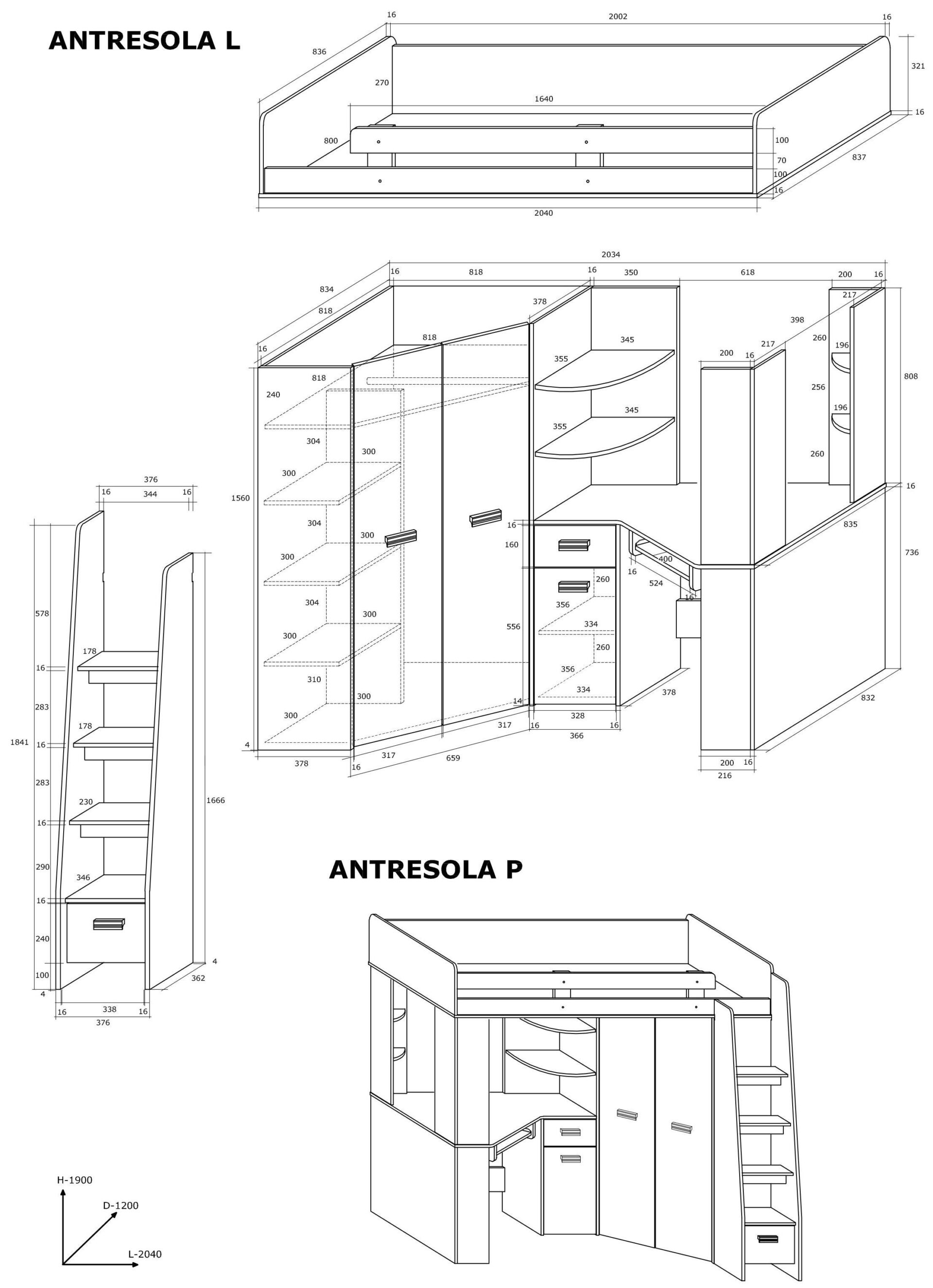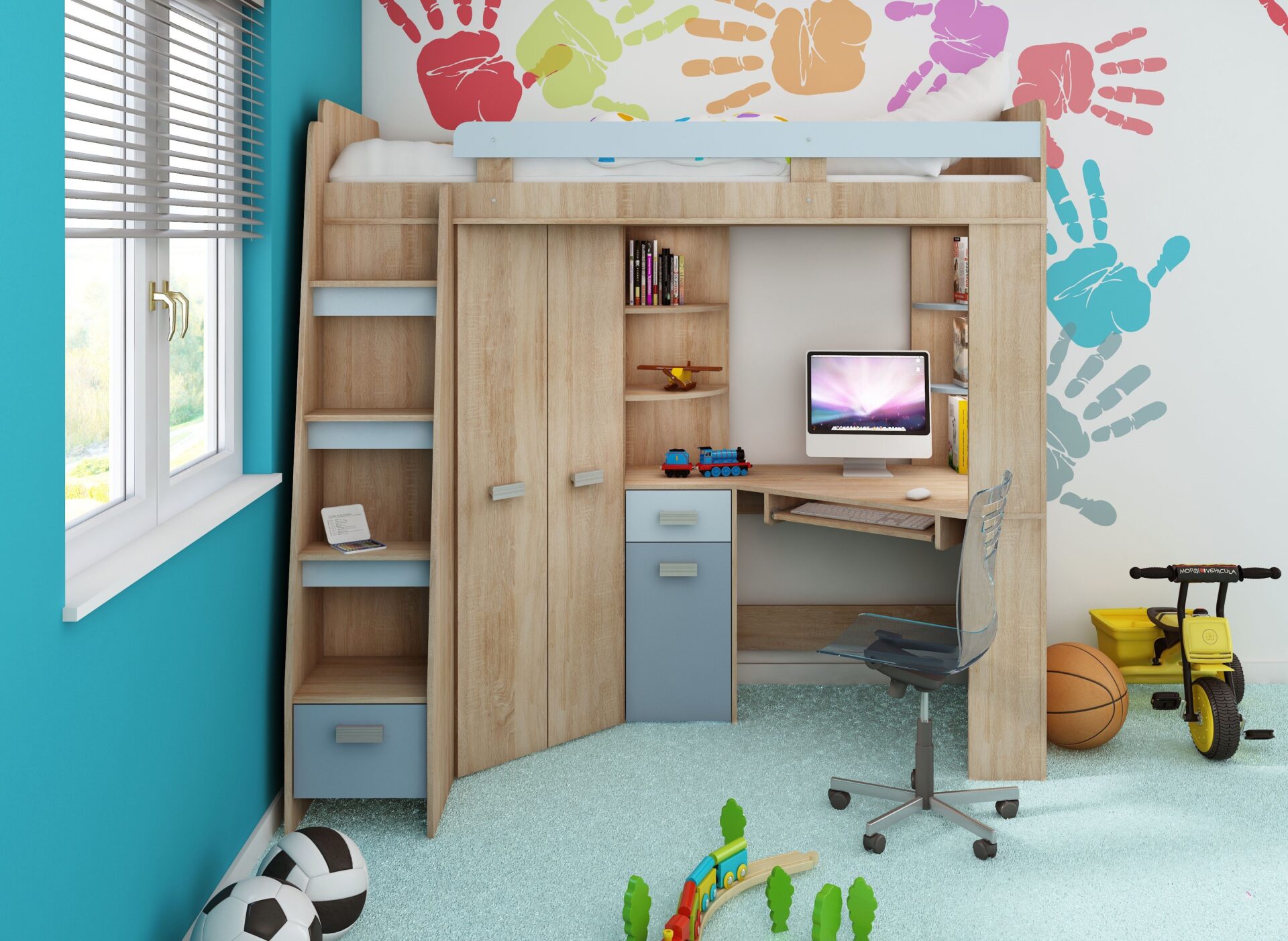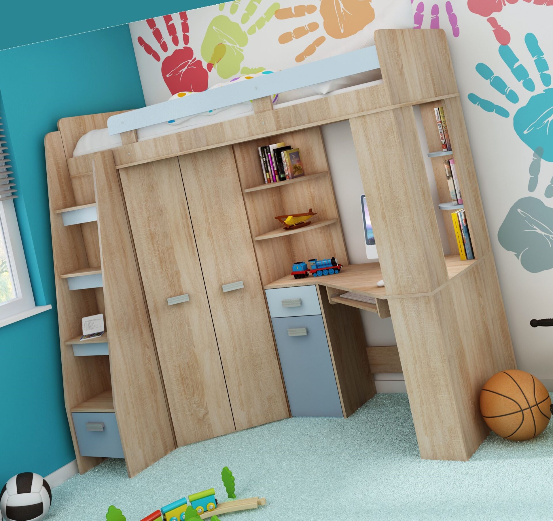 SOLA L mezzanine without mattress 80×200, 16 mm board, ABS edge, max mattress height 10 cm, Color: Sonoma oak / light blue / blue