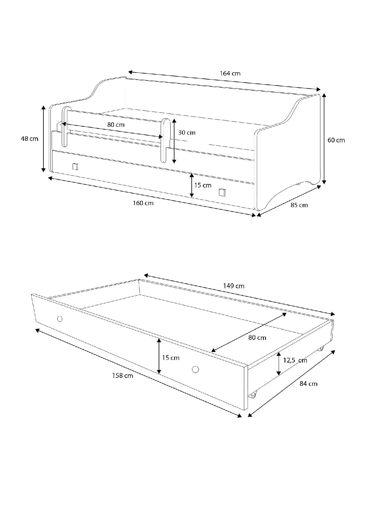 This simple-shaped double bed from the NAOMI II collection features a drawer and a sleeping function, making it perfect for a room for two siblings. It’s also an ideal solution for unexpected guests.