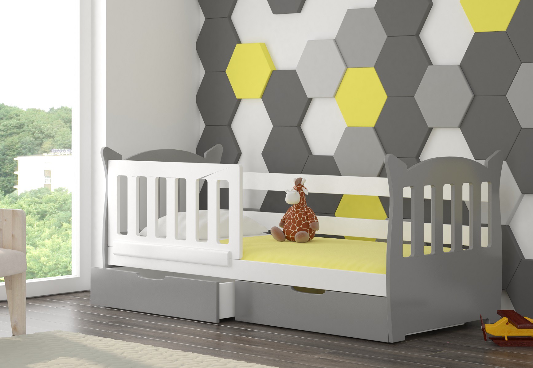 The LENA single bed will perfectly complement a boy’s or girl’s room. This model is complemented by a protective rail for safety during sleep and spacious and functional drawers for bedding. The set also includes a durable frame and a foam mattress with a zippered cotton cover.