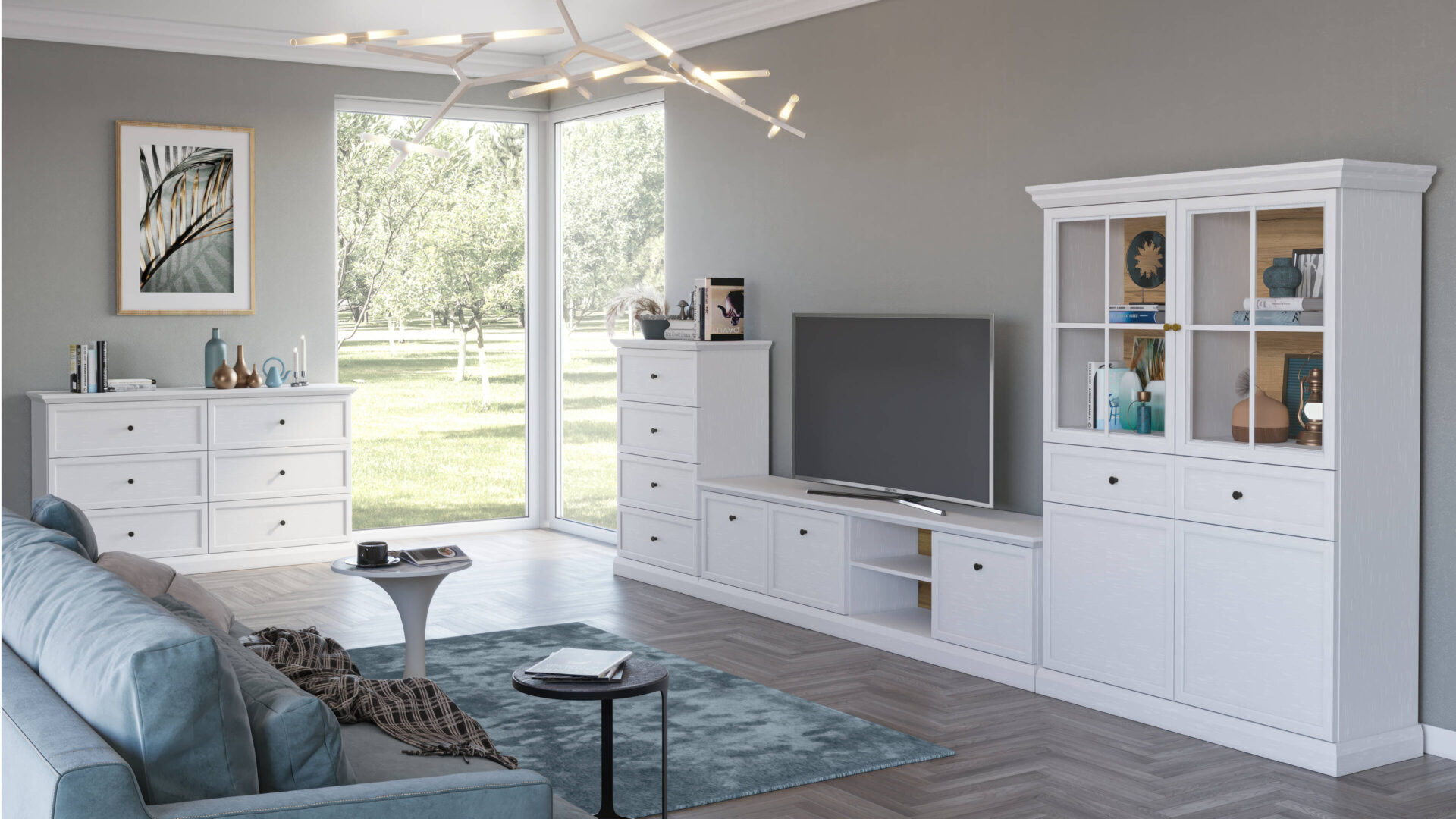 Classic black metal handles add charm and emphasize its modern character. Solid plinths and decorative MDF moldings add solidity and elegance. The body and fronts are made of durable, damage-resistant laminated board, ensuring longevity and ease of cleaning. This is an excellent option for those who value quality and durability.