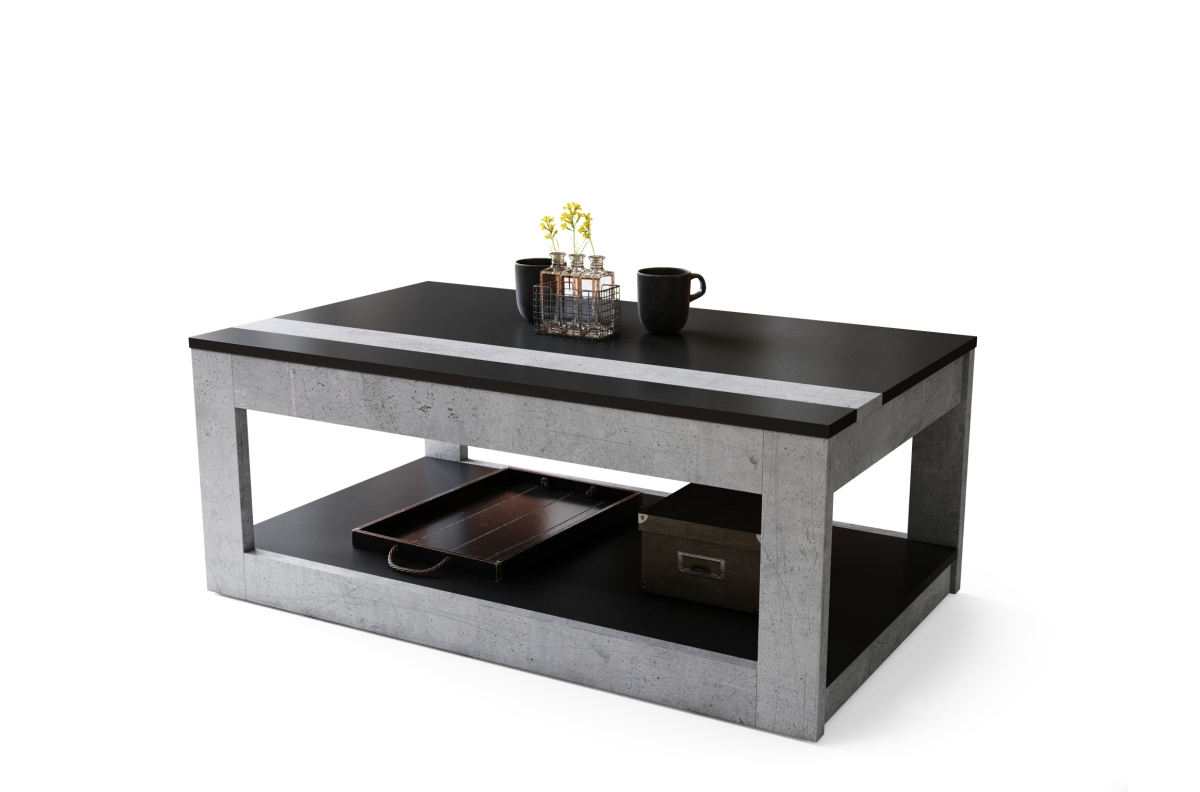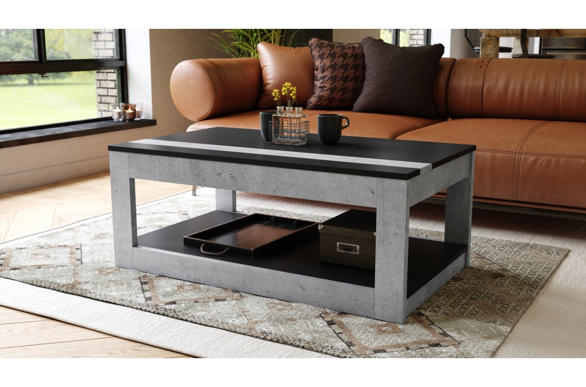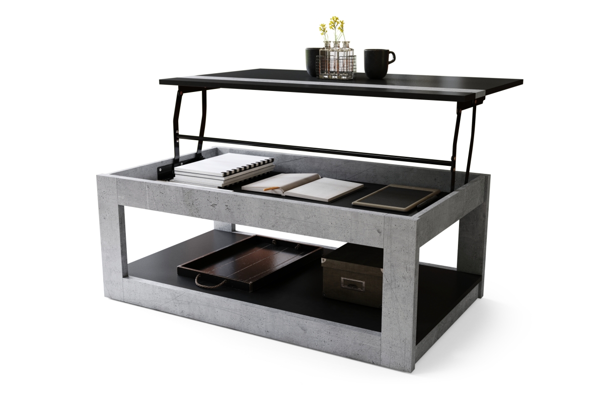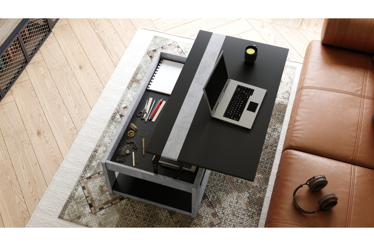 LUSSO matinė juoda / tūkstantmečio betono spalvos – MODERNUS kavos staliukas su pakeliamu stalviršiu + daiktadėže + lentyna (ant ratukų!)