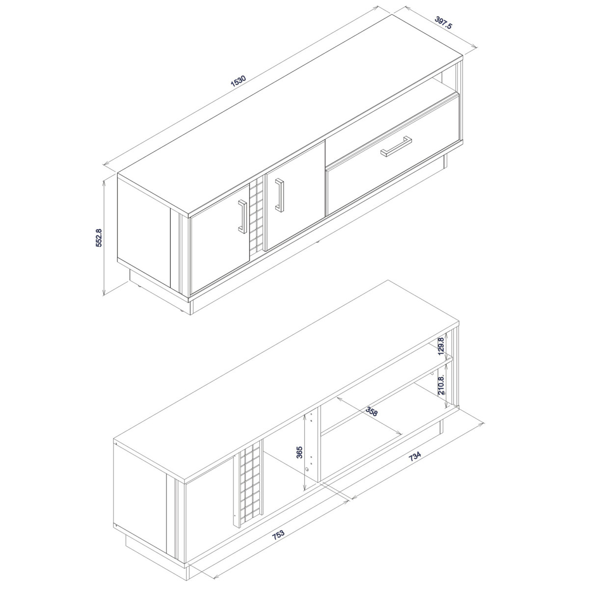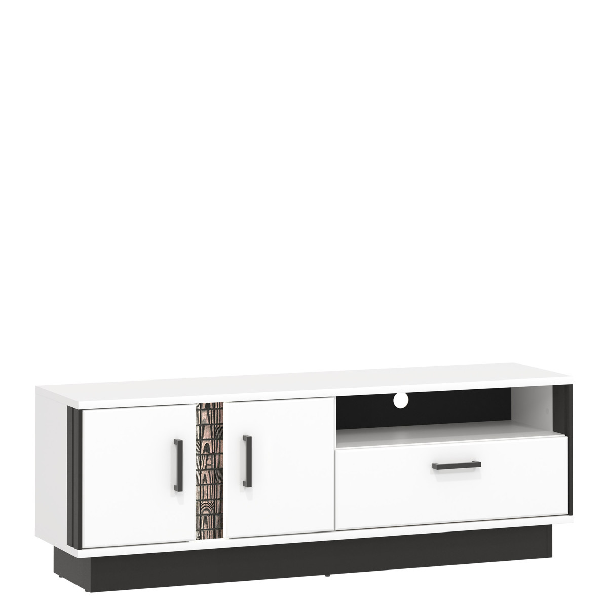 Width 153 cm Depth 39.5 cm Height 54 cm Product weight with packaging 43.75 kg Manufacturer’s code / symbol MR01 Collection name MARCO Name in the b2b system MARCO MR-1 white-black/white-gloss RTV set Number of product packages 2 Style Modern Equipment Assembly instructions / assembly accessories Assembly For self-assembly Body color White / Black Body material / type / thickness 16 mm furniture board / Strip 16 mm MDF furniture board Top body finish / material / type / thickness 22 mm furniture board Bottom body finish / material / type / thickness 22 mm furniture board Body base finish / material / type / thickness 16 mm furniture board Back wall material / type / thickness 2.5 mm HDF furniture board Back wall visible part color Black Front color Gloss White Front material / type / thickness 18 mm MDF furniture board Front hinge ⌀ 35 mm adjustable in three planes Front handle / material / color Plastic / black Hole for RTV cables ⌀ 50 mm External lighting Standard External lighting light color Warm white External lighting energy class A++ Soft-close door system Standard Full extension drawer guides Foot / finish / color Non-adjustable / Furniture glide / plastic / Black Number of doors 2 Number of drawers 1 Number of open niches 1 Number of closed niches 1