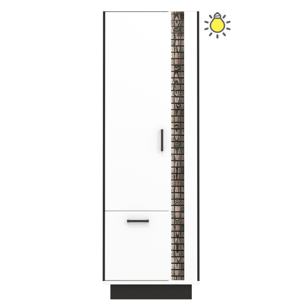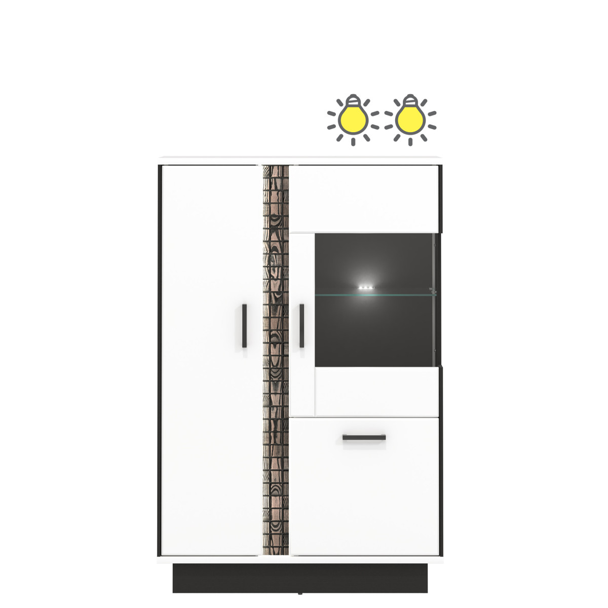 The MARCO MR01 TV stand is a practical piece of furniture that will work well in both living rooms and den spaces. Inside, it features two spacious, lockable compartments, one open compartment, and a drawer, allowing you to organize essential items. The large countertop surface makes it suitable for display. The dominant white color is broken up by black accents, emphasizing the overall style of the stand. A strip of natural wood, illuminated by LED lighting, adds additional charm. The stand’s light colors and minimalist form will create an engaging, modern interior and visually brighten the room. The TV stand is ideal when combined with other pieces from the MARCO series or as a standalone piece, adapting to your room’s décor.