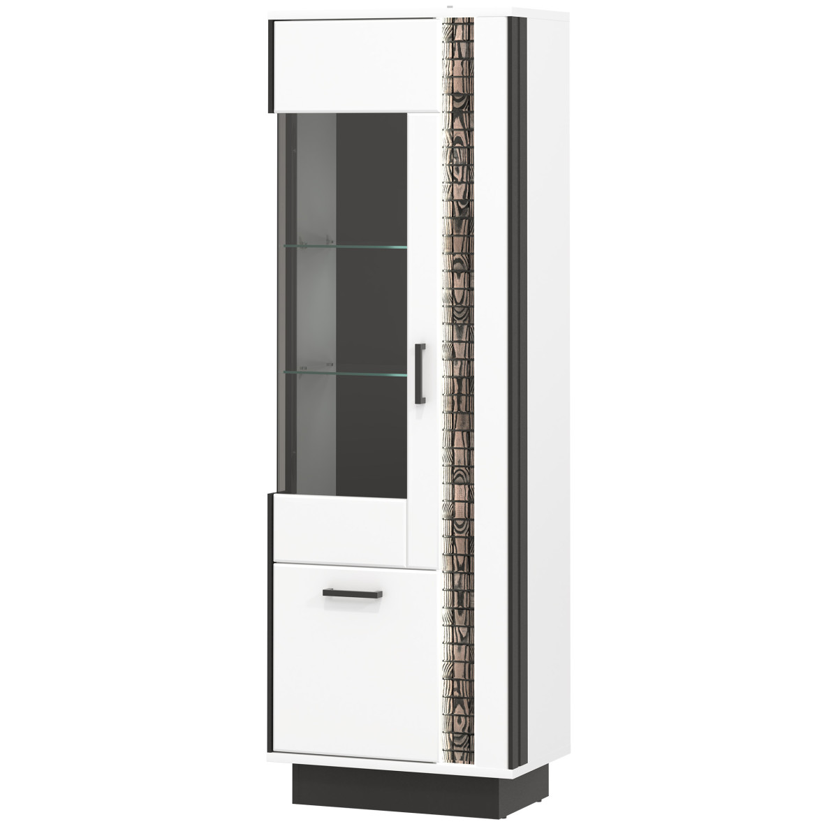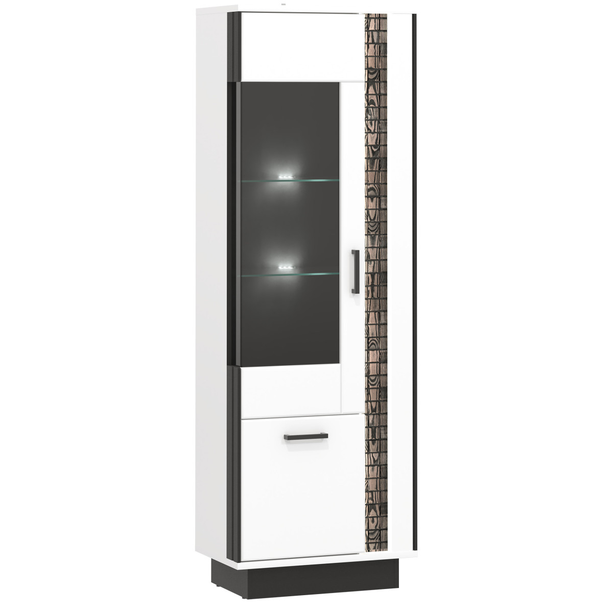 The MARCO MR06 left-hand display cabinet is perfect for a living room or den. It’s a piece of furniture that will add elegance and style to your living room. It’s equipped with five practical storage niches. The main feature of the cabinet is glass shelves located behind the glass front. The glass allows you to display decorative items, and the option of purchasing LED lighting will make them look elegant. The lower section of the cabinet offers space for other items. The dominant white color is broken up by black accents, emphasizing the overall design of the cabinet. A strip of natural wood, illuminated by LED lighting, adds additional charm. The cabinet’s light colors and minimalist form will create an interesting, modern interior and visually brighten the room. The cabinet is ideal in combination with other pieces from the MARCO series or as a standalone piece, adapting to your room’s décor.