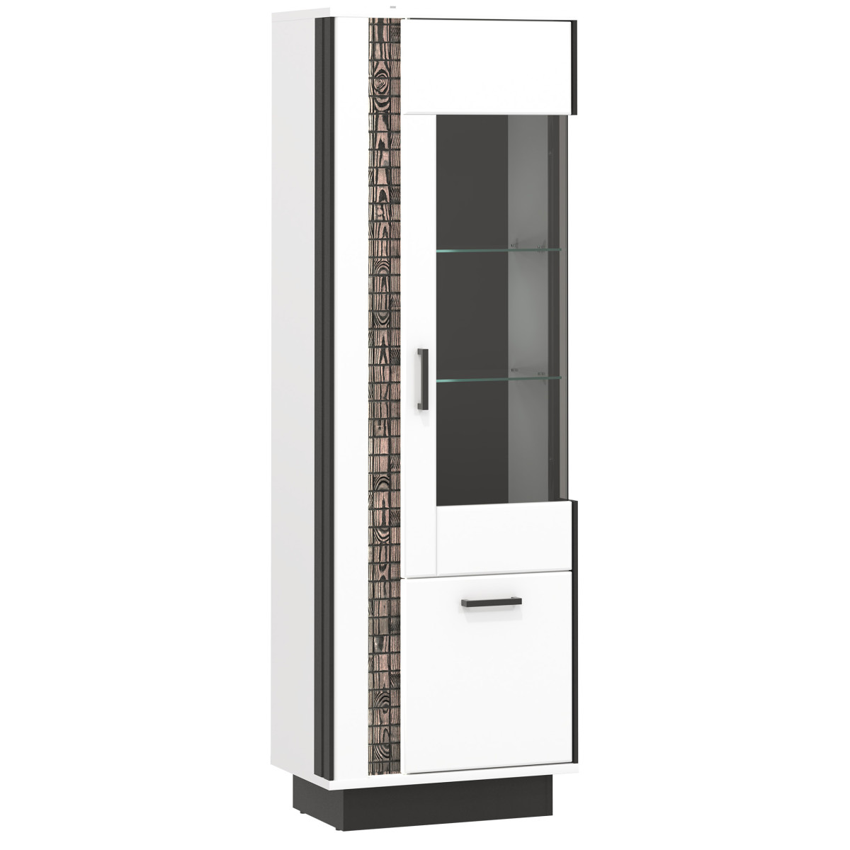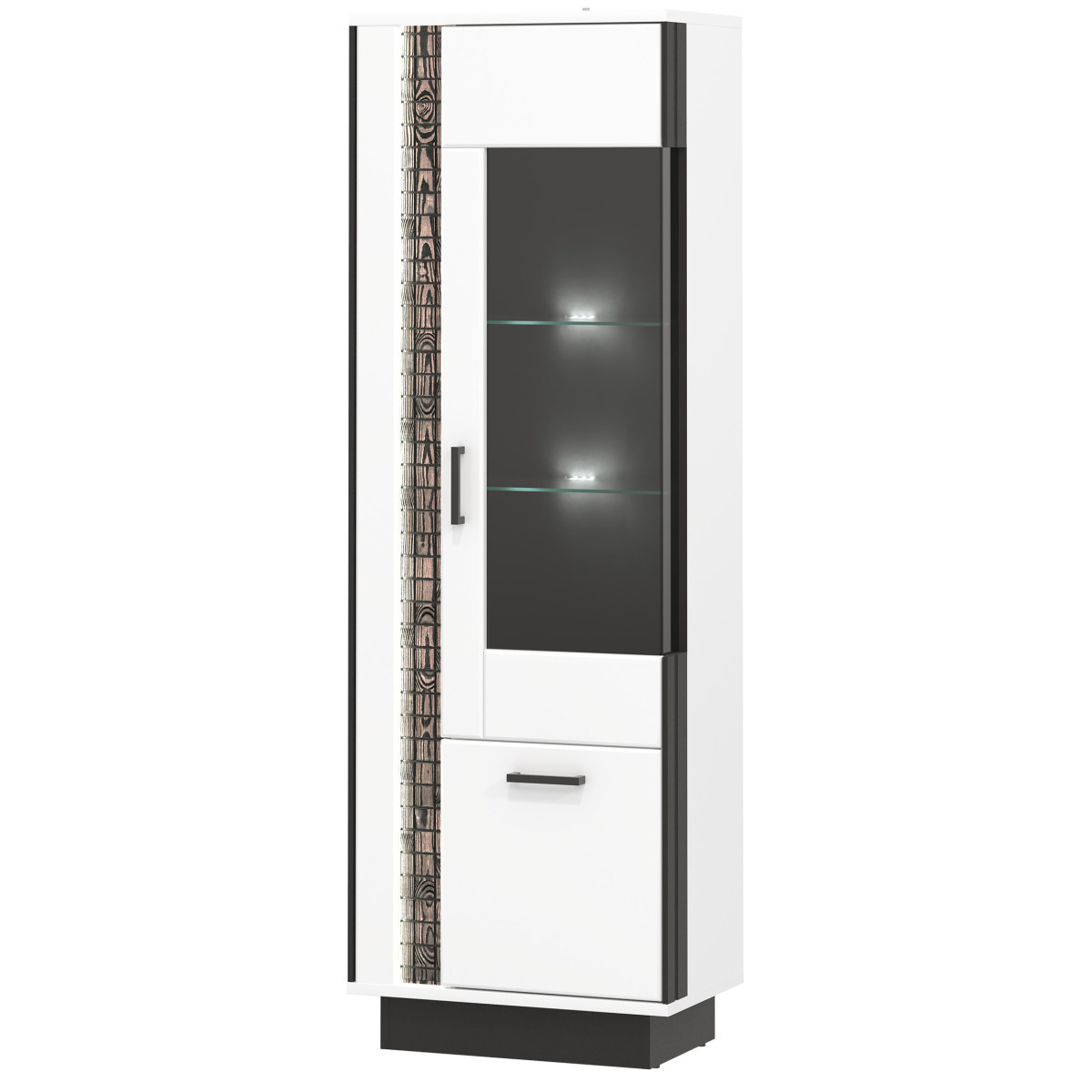The MARCO MR07 right-hand display cabinet is perfect for a living room or den. It’s a piece of furniture that will add elegance and style to your living room. It’s equipped with five practical storage compartments. The main feature of the cabinet is glass shelves located behind the glass front. The glass allows you to display decorative items, and the option of purchasing LED lighting will make them look elegant. The lower section of the cabinet offers space for other items. The dominant white color is broken up by black accents, emphasizing the overall style of the cabinet. A strip of natural wood, illuminated by LED lighting, adds additional charm. The cabinet’s light colors and minimalist form will create an interesting, modern interior and visually brighten the room. The cabinet is ideally suited to combinations with other pieces from the MARCO series or as a standalone piece, adapting to your own room design.