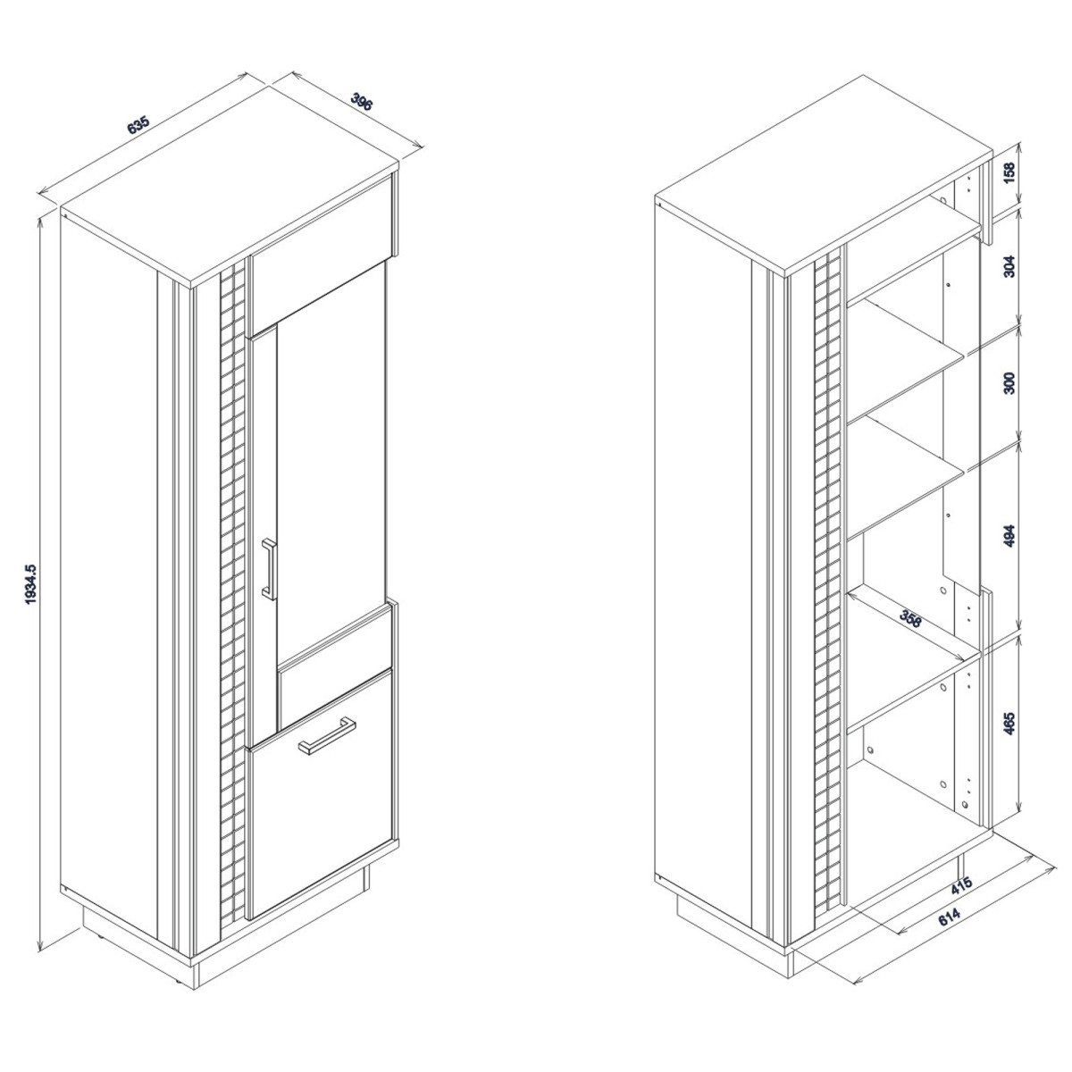 Width 63.5 cm Depth 39.5 cm Height 192 cm Product weight with packaging 56.15 kg Manufacturer’s code / symbol MR07 Collection name MARCO Name in the b2b system MARCO MR-7 white-black/white-gloss DISPLAY CABINET P set Number of product packages 3 Style Modern Equipment Assembly instructions / assembly accessories Assembly For self-assembly Body color White / Black Body material / type / thickness 16 mm furniture board / Strip 16 mm MDF furniture board Top body material / type / thickness 22 mm furniture board Bottom body material / type / thickness 22 mm furniture board Base body material / type / thickness 16 mm furniture board Back wall material / type / thickness 2.5 mm HDF furniture board Back wall visible part color Black Front color White Gloss Front material / type / thickness 18 mm MDF furniture board Front hinge ⌀ 35 mm adjustable in three planes Front handle / material / color Plastic / black Glazed front material / glass color Tempered / Antisol graphite Glazed front glass thickness 4 mm Glass shelf glass color Colorless Glass shelf glass thickness 6 mm Glass shelf quantity 2 External lighting As standard External lighting light color Cold white External lighting energy class A++ Soft-close door system As standard Foot / finish / color Non-adjustable / Furniture glide / plastic / Black Number of doors 2 Number of recesses closed behind the front glass 3 Number of recesses closed 2