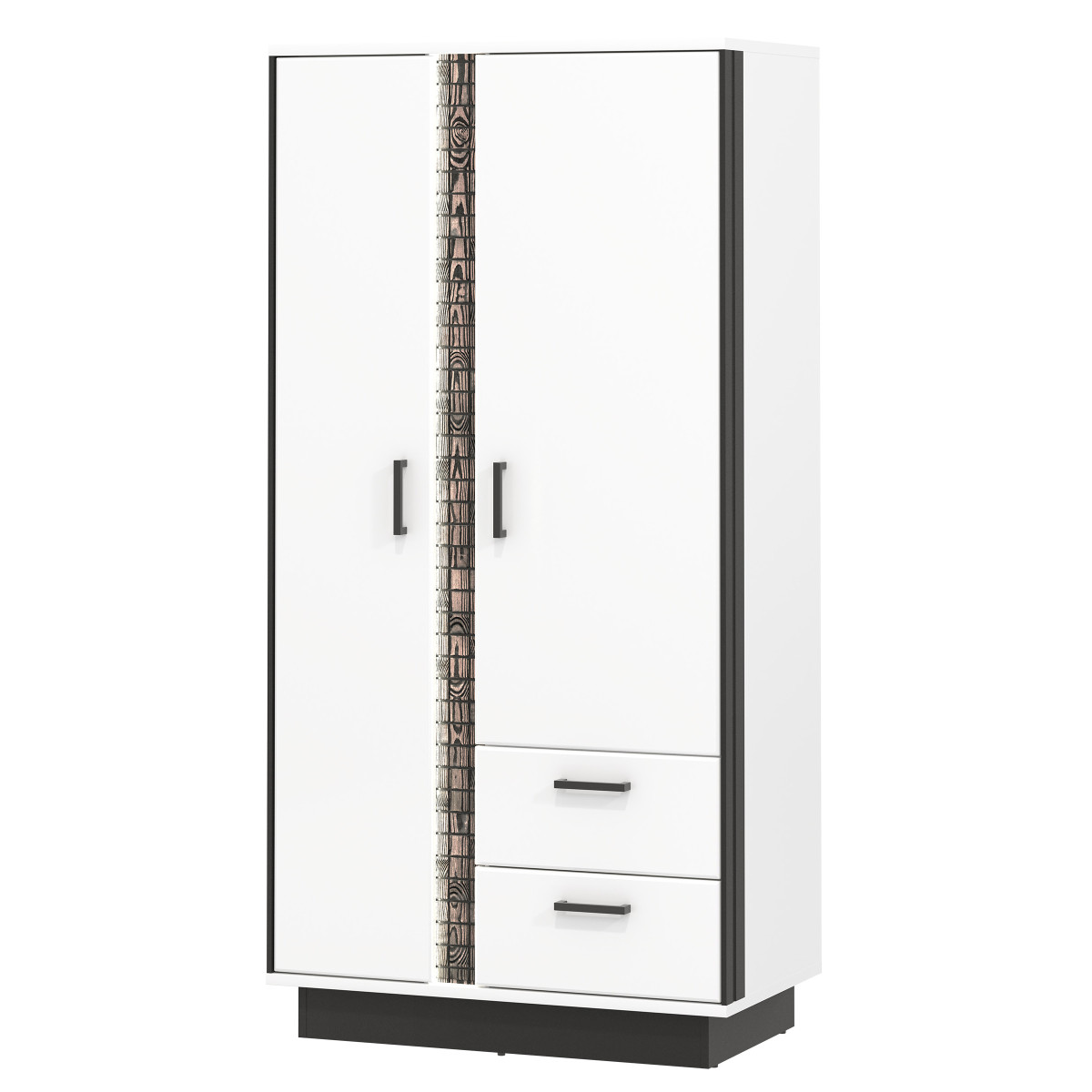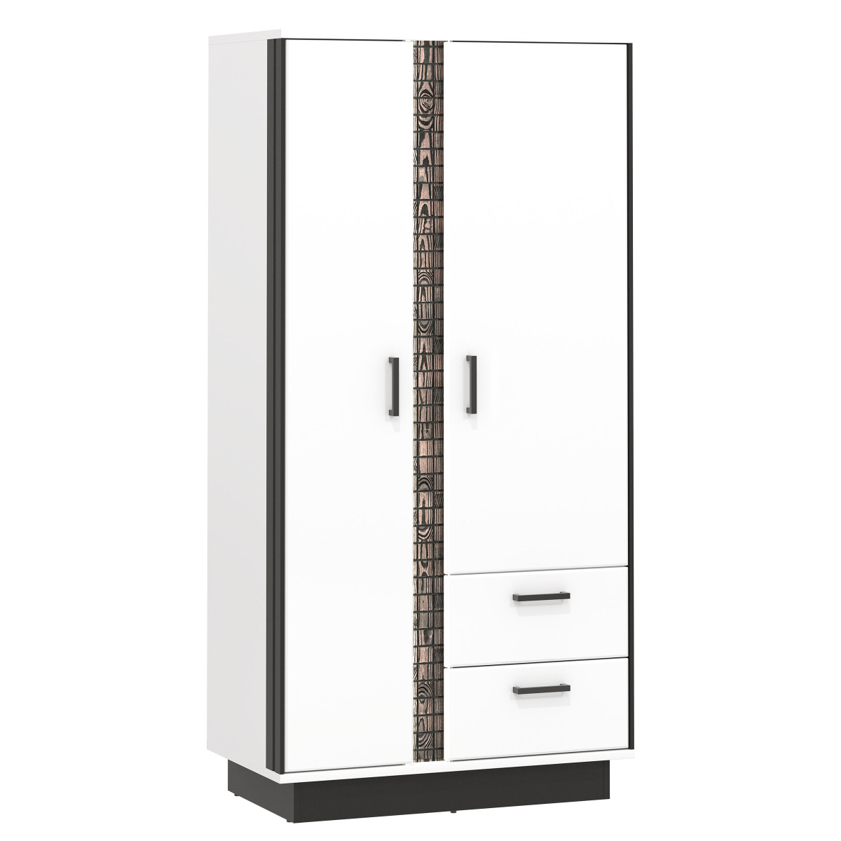 The MARCO MR09 wardrobe is a versatile piece of furniture that can easily fit into any living room or den. The two-door wardrobe offers functional space, with two drawers, a clothes rail, and an upper recess for convenient clothing storage. The dominant white color is broken up by black accents, emphasizing the wardrobe’s overall style. A natural wood strip, illuminated by LED lighting, adds further charm. The wardrobe’s light colors and minimalist form will create an engaging, modern interior and visually brighten the room. The wardrobe is ideally suited to combinations with other pieces from the MARCO series or as a standalone piece, adapting to your own room design.