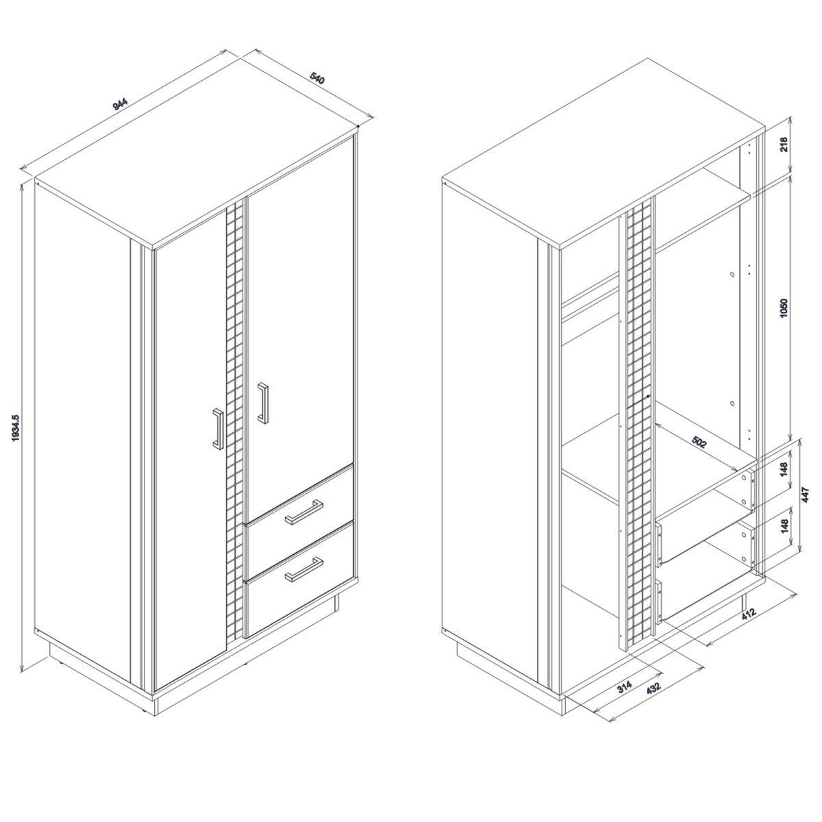 Width 94.5 cm Depth 54 cm Height 192 cm Product weight with packaging 87.90 kg Manufacturer’s code / symbol MR09 Collection name MARCO Name in the b2b system MARCO MR-9 white-black/white-gloss WARDROBE 2D set Number of product packages 3 Style Modern Equipment Assembly instructions / assembly accessories Assembly For self-assembly Body color White / Black Body material / type / thickness 16 mm furniture board / Strip 16 mm MDF furniture board Top body finish / material / type / thickness 22 mm furniture board Bottom body finish / material / type / thickness 22 mm furniture board Base body finish / material / type / thickness 16 mm furniture board Shelf color White Shelf material / type / thickness 16 mm furniture board Crown type shelf quantity 1 Back wall material / type / thickness 2.5 mm HDF furniture board Back wall – visible part color Black Front color White Gloss Front material / type / thickness 18 mm MDF furniture board Front hinge ⌀ 35 mm adjustable in three planes Front handle / finish / color Plastic / black External lighting Standard External lighting Light color: Cool white External lighting: Energy class: A++ Soft-close door system: Standard Full extension drawer guides Foot / finish / color: No adjustment / Furniture glide / plastic / Black Number of doors: 2 Number of drawers: 2 Number of closed niches: 2 Body equipment: Standard 1 hanging rail