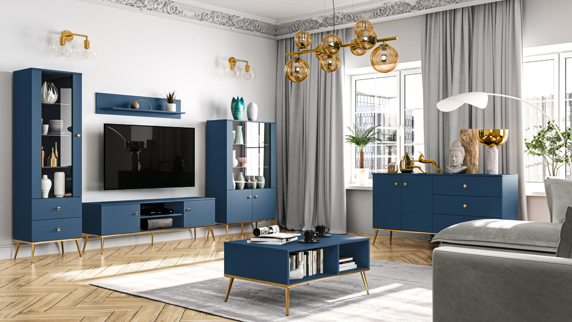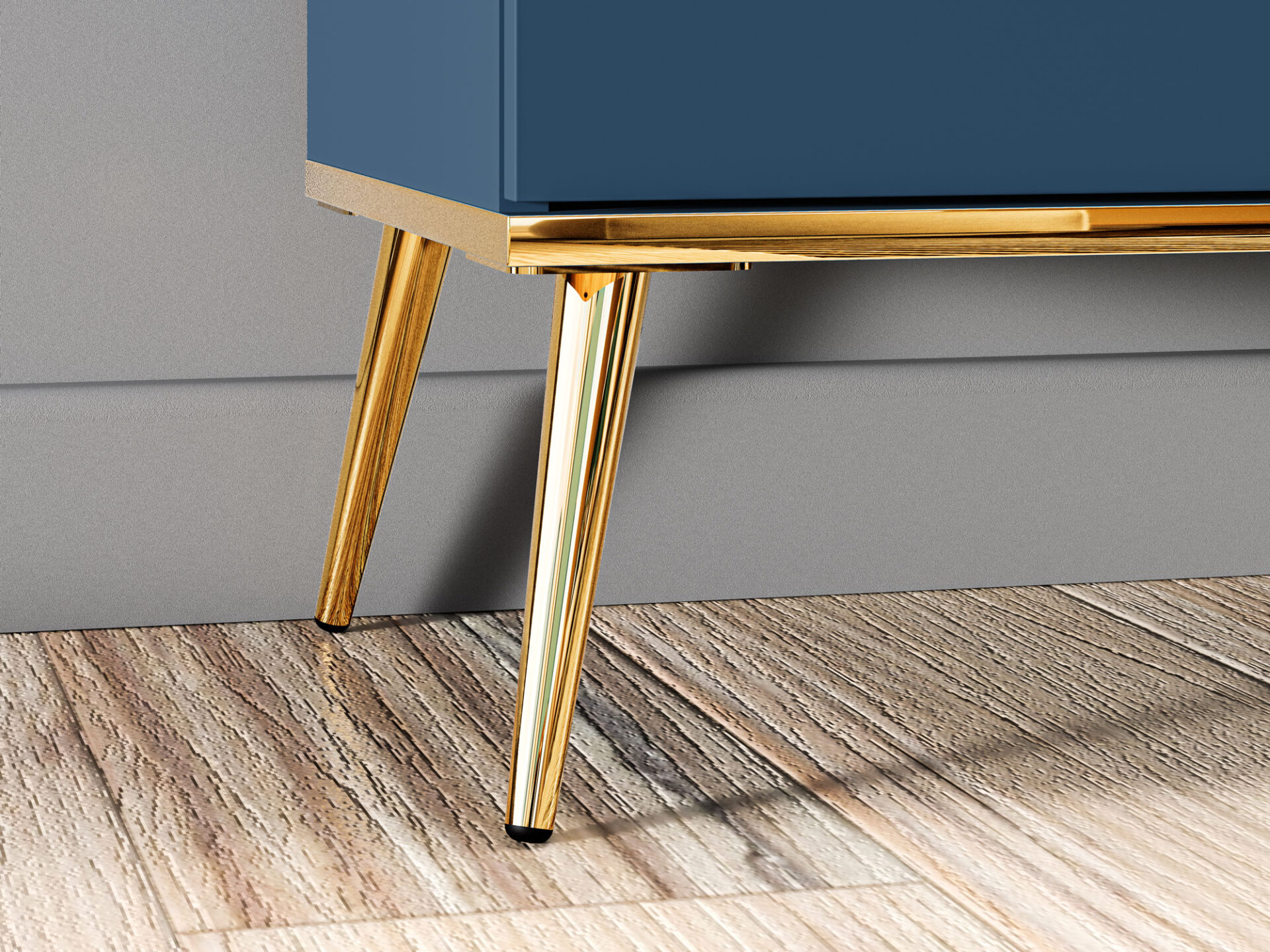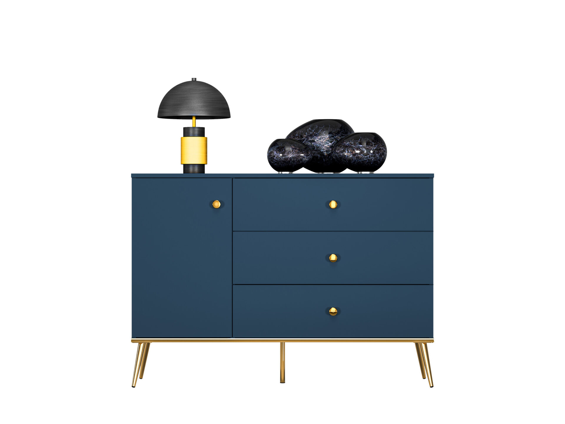 The Marine 04 chest of drawers is the perfect piece for a contemporary living room or bedroom. The top allows you to display your favorite items: vases, lamps, or travel souvenirs. Behind the doors are two spacious shelves, perfect for storing towels, tablecloths, or other home textiles. The other half of the chest of drawers consists of three large, spacious drawers – perfect for storing table accessories like cutlery, clothes, and underwear in the bedroom. All pieces in the Marine collection are characterized by a deep, dark blue finish. The handles, legs, and bottom panel veneer – thanks to their classic gold color – emphasize the elegant and timeless character of Marine furniture.